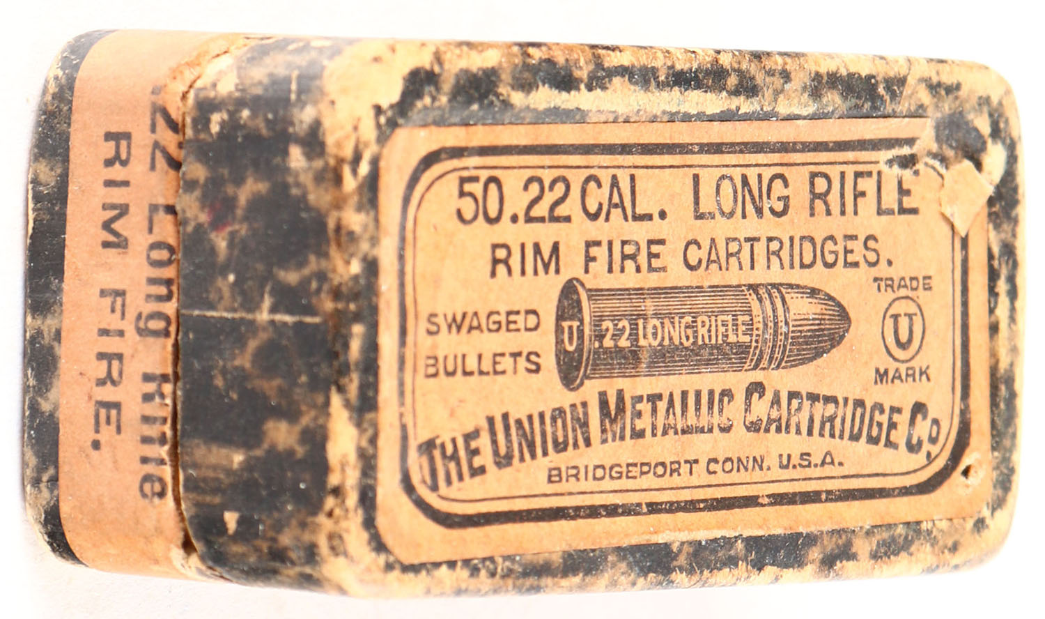 UMC, Rim Fire Cartridges, .22 Long Rifle, RHWeb: UMC-8 LR-3c, Partial 35rds., 2pc. Black mottled box with buff top & side sealing labels, box is solid with very good color, some age soiling, some edge & corner wear, side sealing label is 70% intact, ammo is fair. Grade: Very Good - Value: 10 to 50