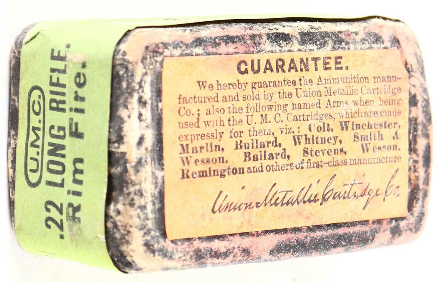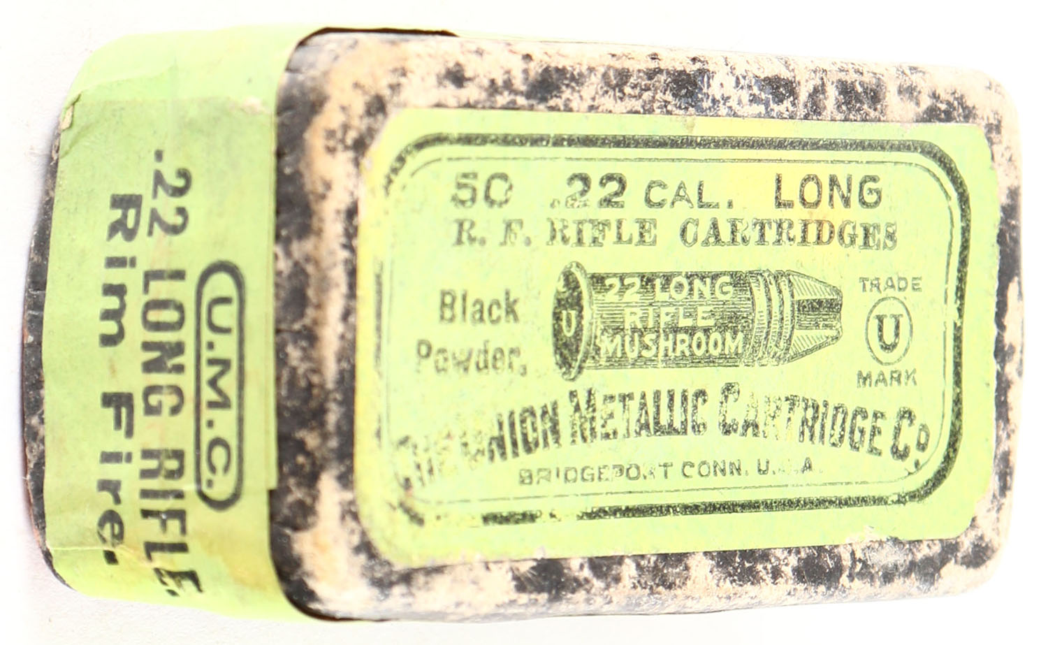 UMC, R.F. Rifle Cartridges, .22 Long Rifle Mushroom, Black Powder, RHWeb: UMC-8 LR-5, FULL & SEALED, 2pc. Black mottled box with green top & side sealing labels, box is solid with very good color, minor shelf wear & sun spotting, some corner wear, very minor edge wear, labels are intact. Grade: Excellent - Value: 150 to 450