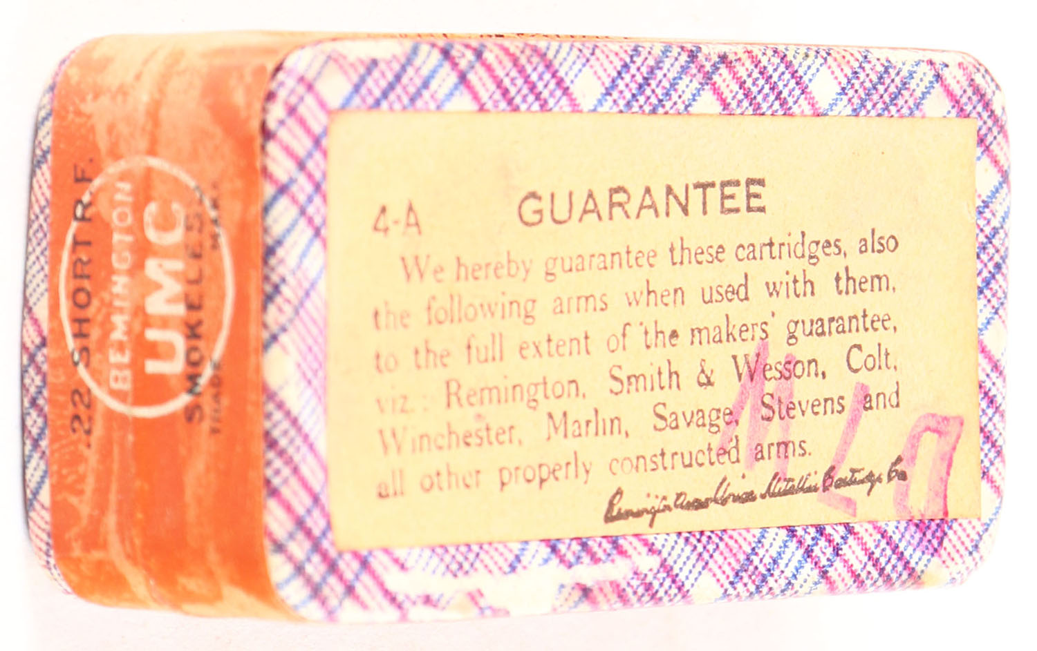 REM-UMC, R.F. Smokeless, .22 Short, Ungreased, RHWeb: REM-1 S-4A, FULL & SEALED< 2pc. Purple fabric box with orange top & side sealing labels, box is solid with excellent color, minor shelf wear on sides, corners are mostly sharp, edges are crisp, labels are intact. Grade: Excellent ++ - Value: 100 to 300