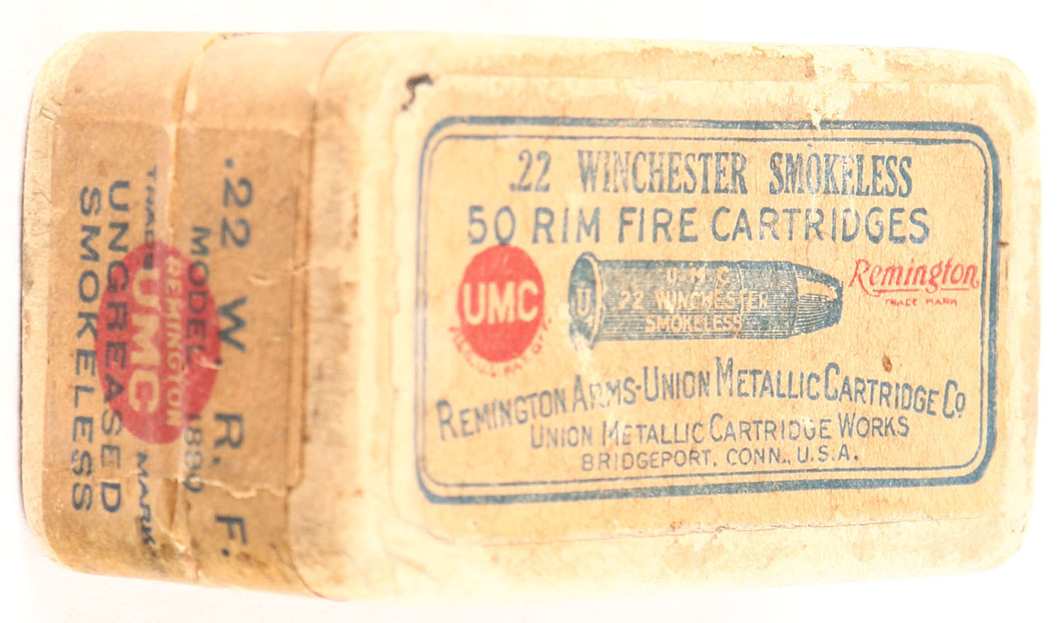 REM-UMC, Rim Fire Cartridges, .22 Winchester Rim Fire, RHWeb: REM-1 WRF-4, FULL & SEALED, 2pc. Buff box with buff top & side sealing labels, box is solid with very good color, some age soiling, minor edge & corner wear, top has been written on, labels are intact. Grade: Excellent - Value: 40 to 160