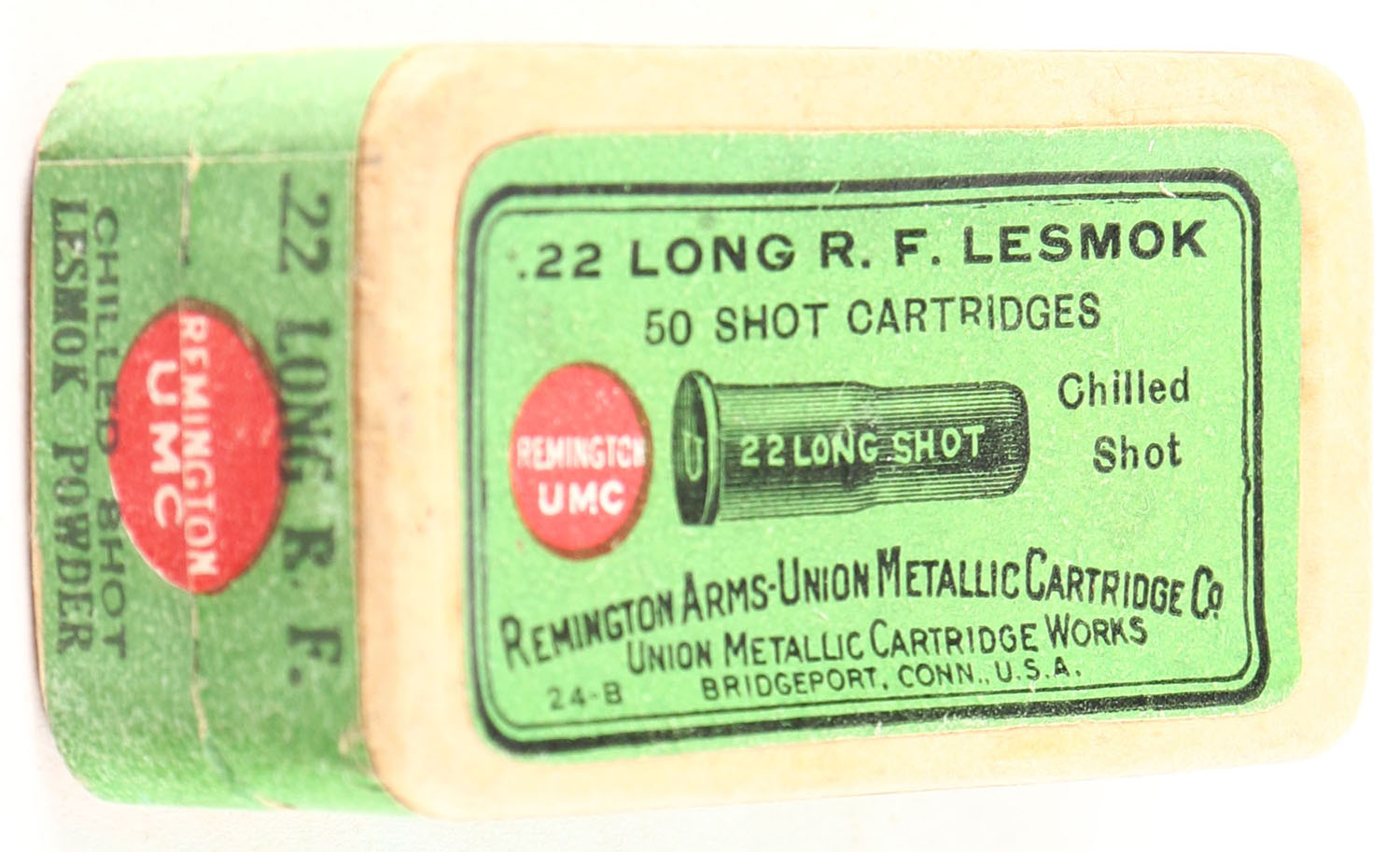 REM-UMC, R.F. Lesmok, .22 Long Shot, RHWeb: REM-2 L-4A, FULL & SEALED, 2pc. Buff box with green top & side sealing labels, box is solid with excellent color, very minor age soiling, corners are mostly sharp, edges are crisp, labels are intact. Grade: Excellent ++ - Value: 40 to 120