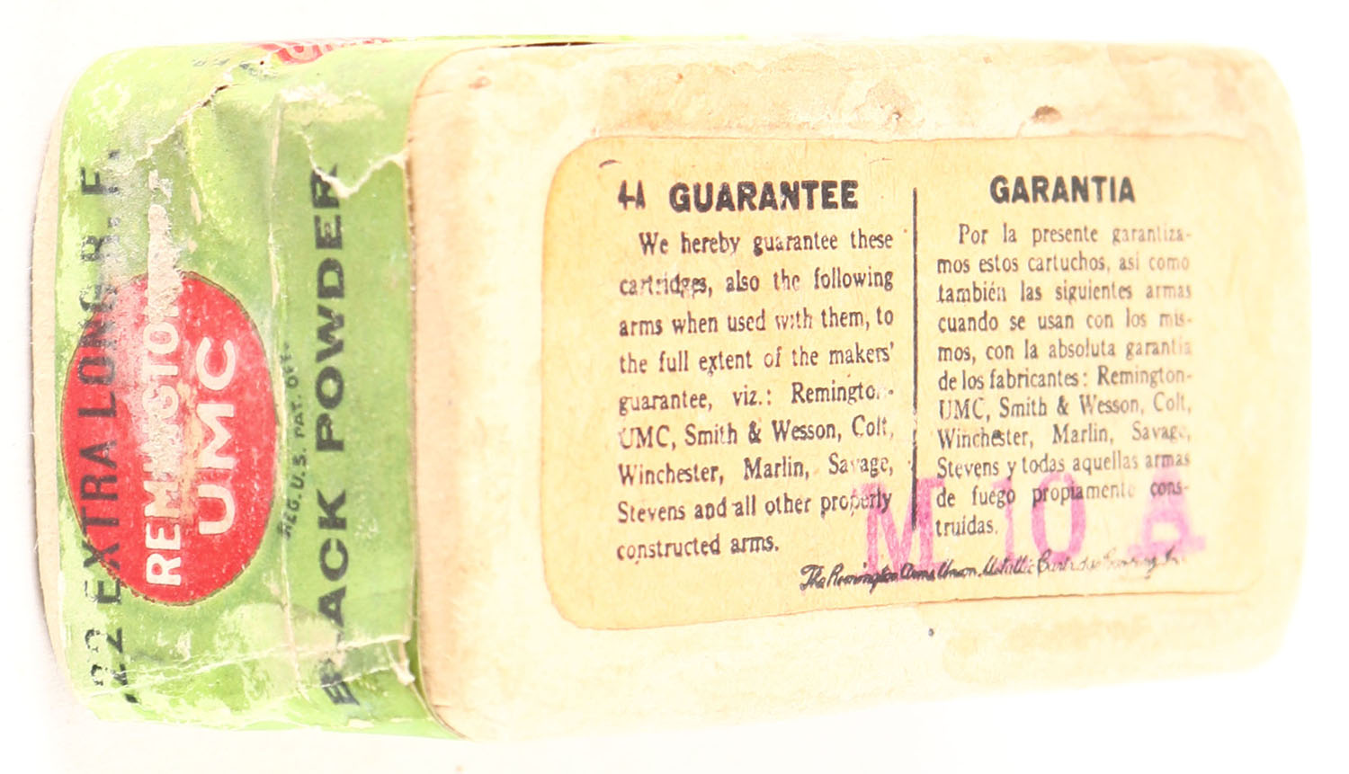 REM-UMC, Rim Fire Cartridges, .22 Extra Long, RHWeb: REM-2 XL-1B, FULL & SEALED, 2pc. Buff box with green top & side sealing labels, box is solid with very good to excellent color, minor age soiling, shelf wear on sides & ends, very minor corner wear, edges are crisp, side sealing label is 99% intact, box feels very slightly swollen. Grade: Excellent - Value: 100 to 400