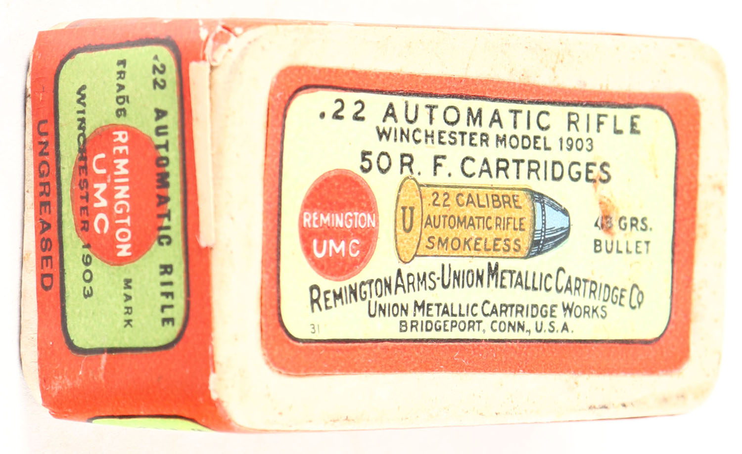 REM-UMC, R.F. Cartridges, .22 Automatic Rifle, RHWeb: REM-2 WA-1D, FULL & SEALED, 2pc. Buff box with green/red top & side sealing labels, box is solid with excellent to minty color, minor staining, corners are mostly sharp, edges are crisp, labels are intact. Grade: Excellent + - Value: 80 to 240