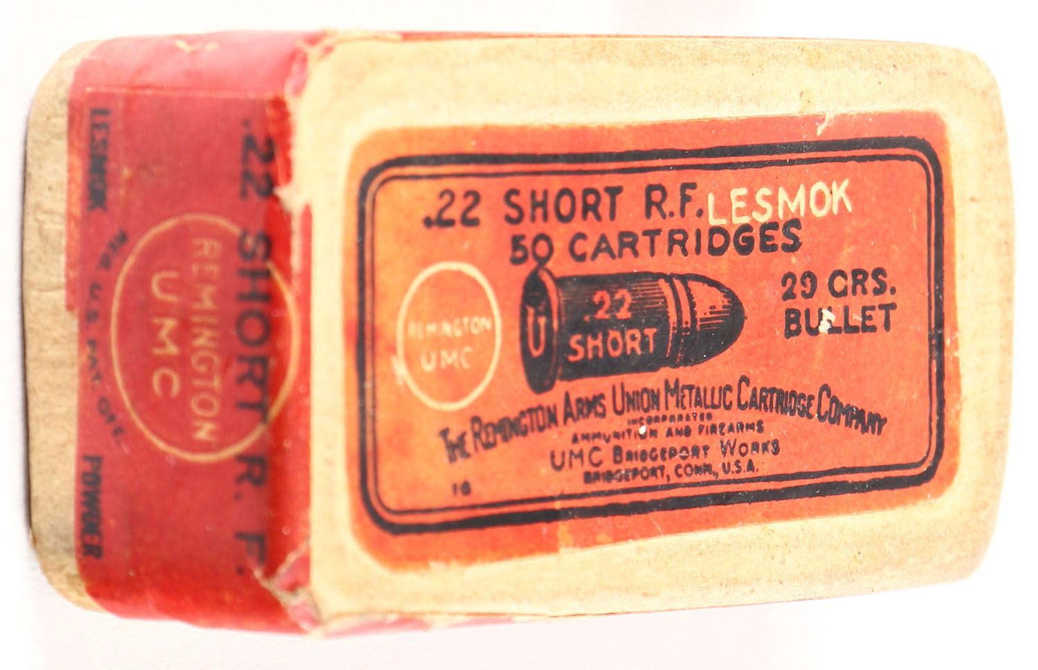 REM-UMC, R.F. Lesmok, .22 Short, RHWeb: REM-3 S-2A, Full, 1pc. Buff box with red top & side sealing labels, box is solid with very good color, some age soiling, minor edge & corner wear, labels are intact. Grade: Very Good ++ - Value: 20 to 80
