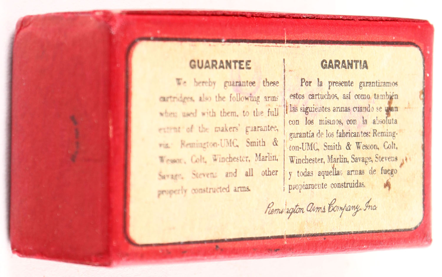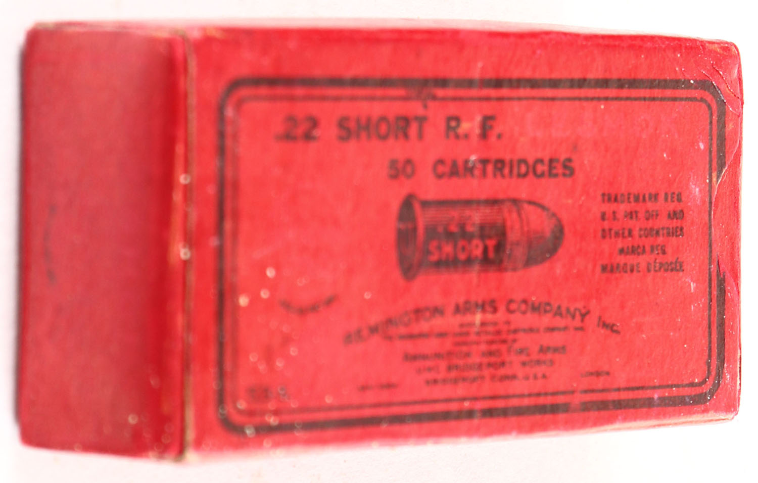 REM-UMC, R.F. Lesmok, .22 Short, RHWeb: REM-5 S-2, Full, 1pc. Red box, box appears to have a printing error as there is no white print anywhere on box, box is solid with excellent color, very minor corner ding on top right corner, corners otherwise mostly sharp, edges are mostly crisp, end flaps are solid, ammo is fair to good. Grade: Excellent + - Value: 40 to 200