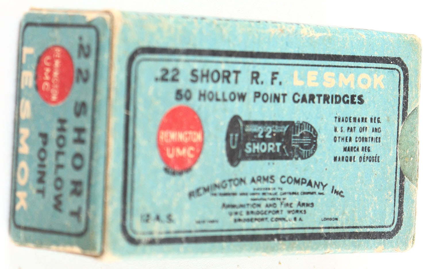 REM-UMC, R.F. Lesmok, .22 Short Hollow Point, RHWeb: REM-5 S-3, Full, 1pc. Blue black & red box, box is solid with very good to excellent color, minor age soiling & shelf wear, minor edge & corner wear, end flaps are solid, ammo is very good. Grade: Excellent - Value: 40 to 200