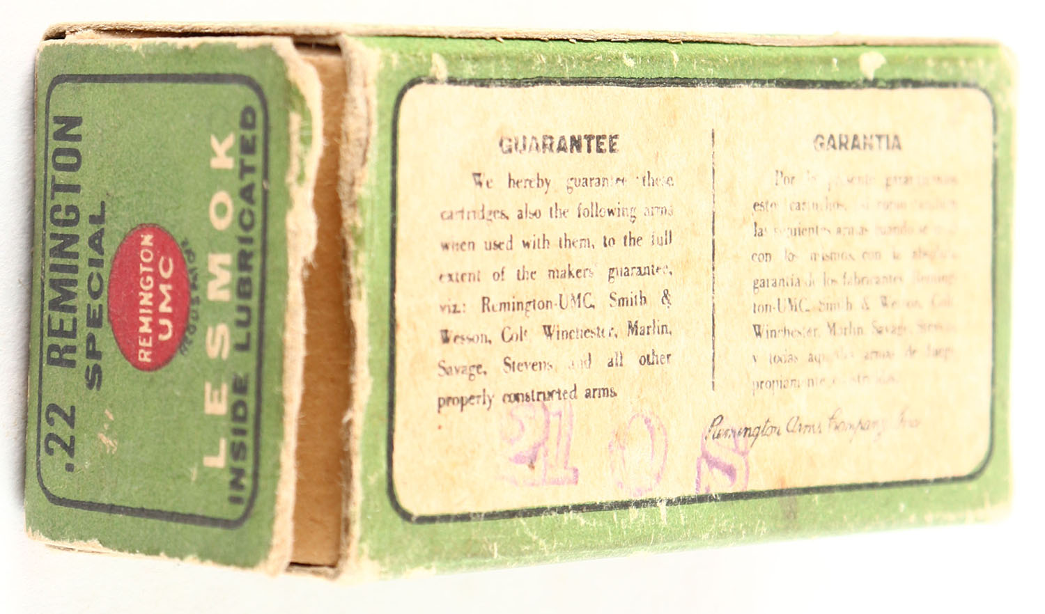 REM-UMC, Lesmok, .22 Remington Special, RHWeb: REM-5 RS-3, Full, 1pc. Green black & red box, right end flap is torn, very good to excellent color, minor age soiling & shelf wear, minor edge & corner wear, left end flap is solid, ammo is excellent. Grade: Very Good + - Value: 50 to 250