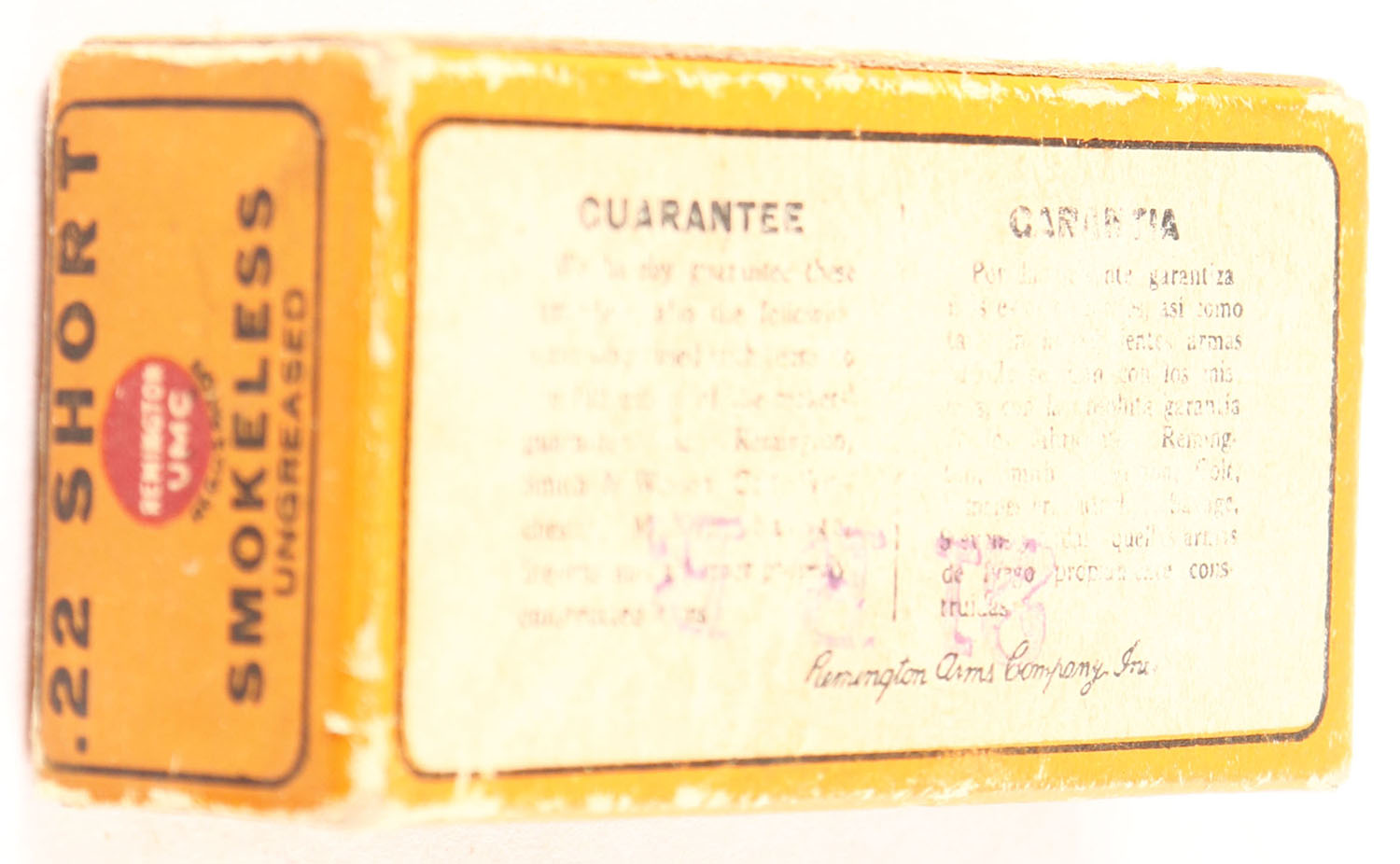 REM-UMC, R.F. Smokeless, .22 Short, RHWeb: REM-6 S-5b, Full, 1pc. Orange black & red box, box is solid with excellent color, minor corner wear, some edge wear, end flaps are solid, ammo is very good to excellent. Grade: Excellent - Value: 30 to 90