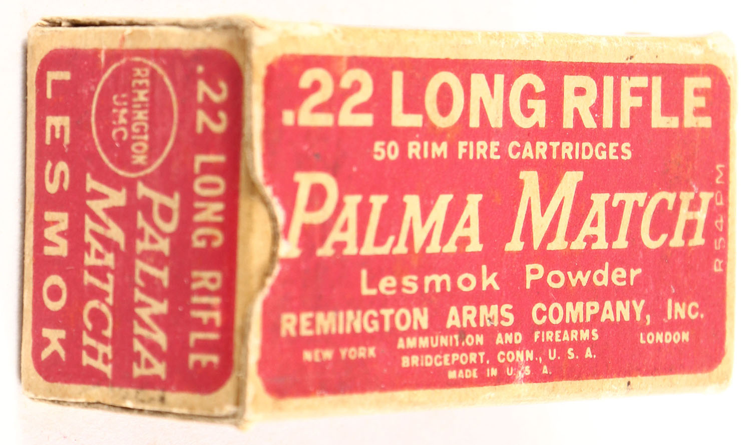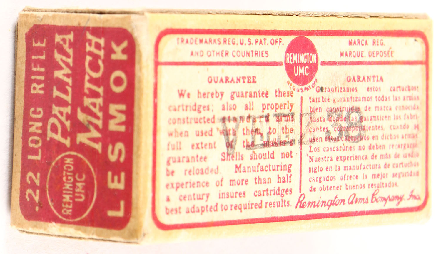 Remington, Palma Match, .22 Long Rifle, VEEZ 38, RHWeb: REM-52 LR-5b, Full, 1pc. Red & buff box, box is solid with very good color, some age soiling, minor corner wear, very minor edge wear, end flaps are solid, ammo is very good to excellent. Grade: Very Good ++ - Value: 10 to 50