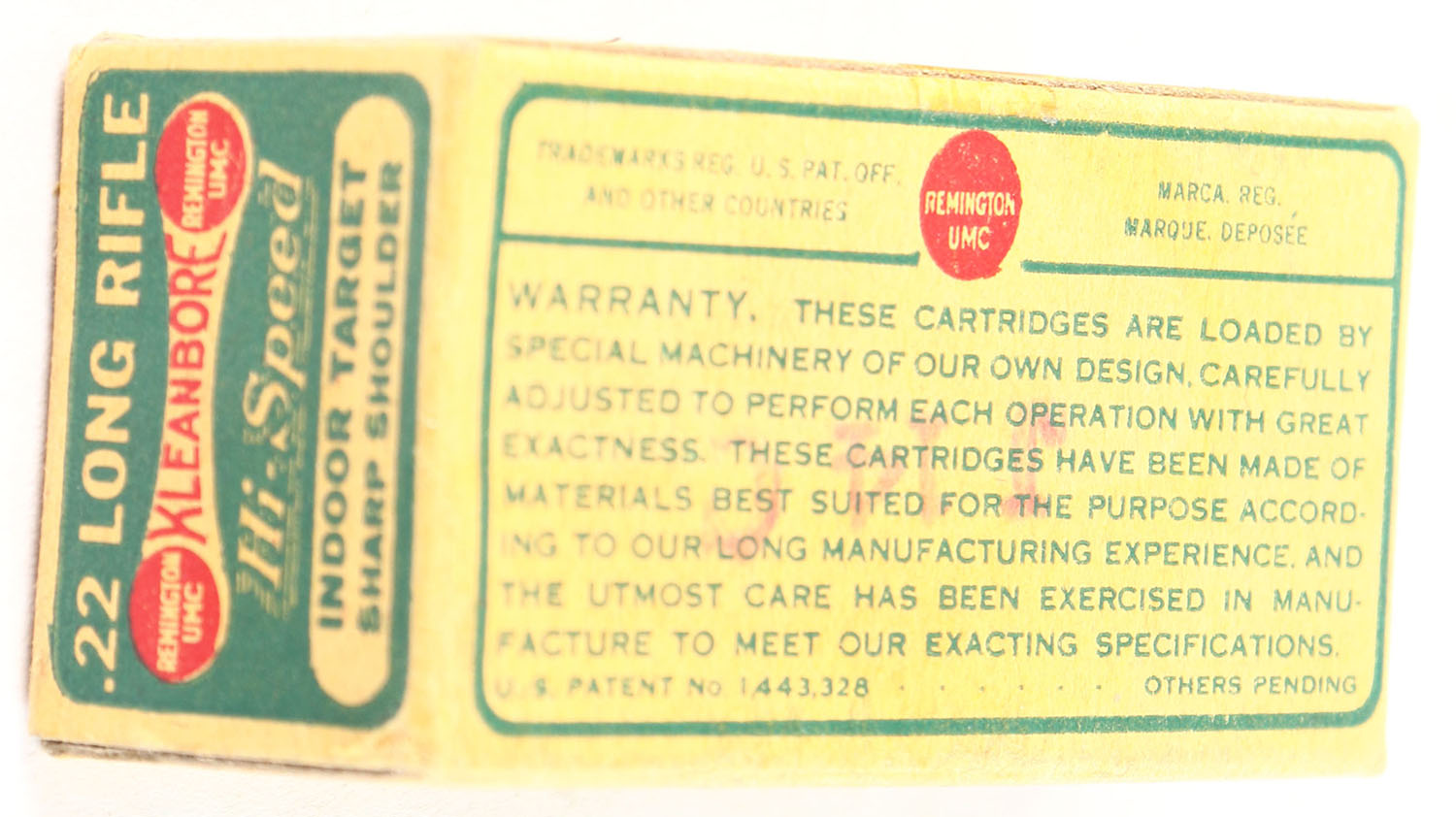 RARE! Remington, Indoor Target Sharp Shoulder, Kleanbore Hi-Speed, .22 Long Rifle, RHWeb: REM-69 LR-1a, Full, 1pc. Green buff & red dog bone box, box is solid with excellent color, very minor corner wear, edges are crisp, end flaps are solid, ammo is very good to excellent. Grade: Excellent + - Value: 30 to 90