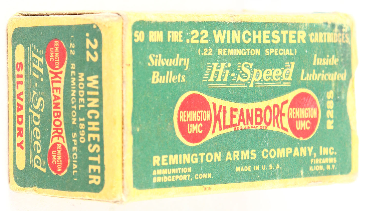 Remington, Hi-Speed Kleanbore Silvadry, .22 Winchester (.22 Remington Special, RHWeb: REM-7.5 WRF-4, Full, 1pc. Green buff & red dog bone box, box is solid with excellent color, very minor age soiling, some corner wear, minor edge wear, end flaps are solid, ammo is excellent. Grade: Very Good ++ - Value: 100 to 300