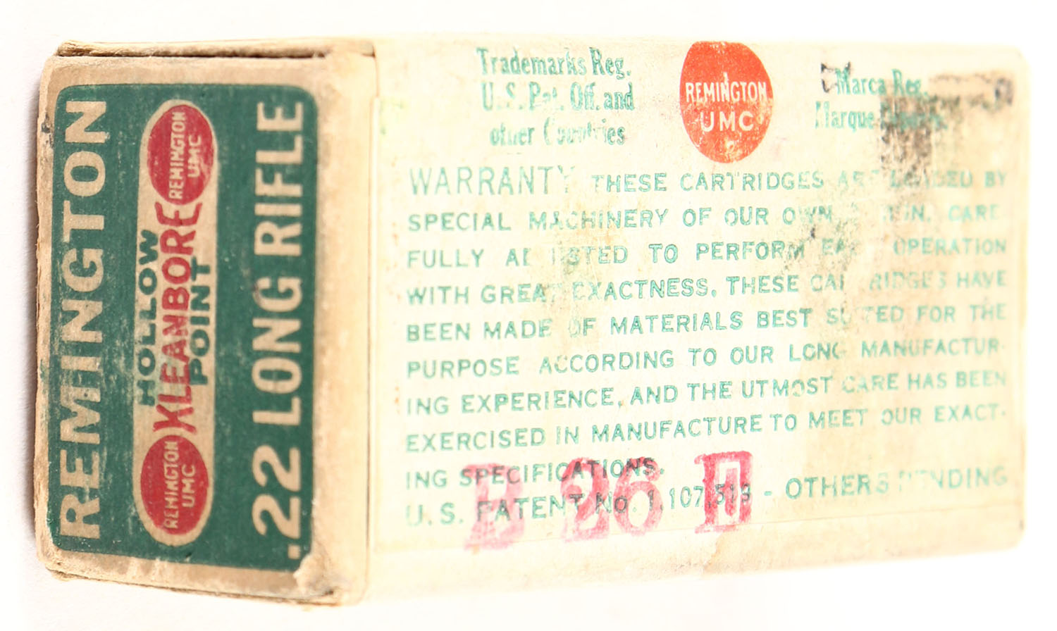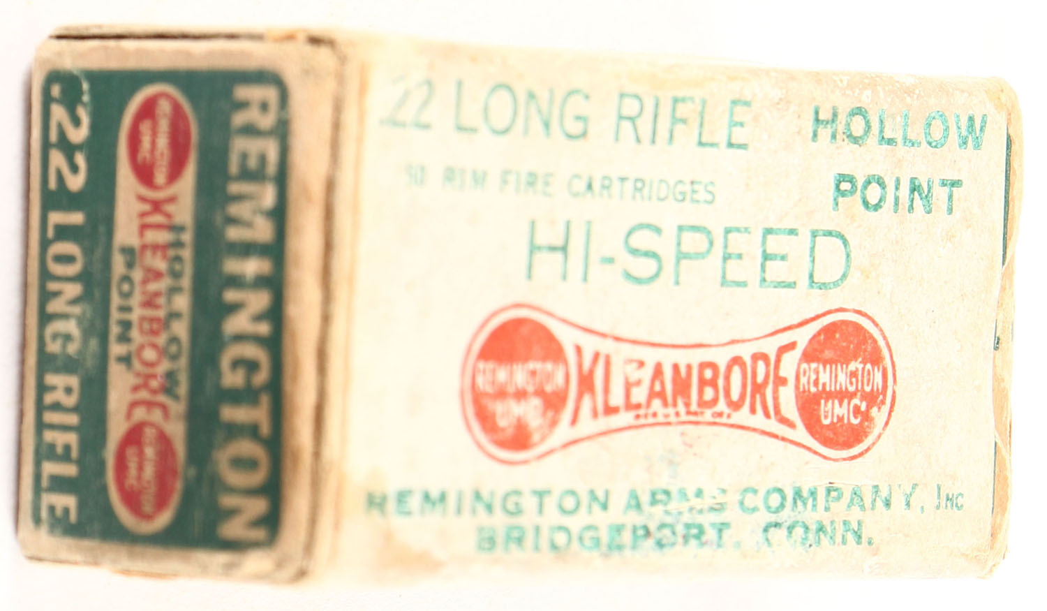 Remington, Hi-Speed Kleanbore, .22 Long Rifle Hollow Point, RHWeb: REM-7.4 LR-5, Full, 1pc. Dog bone box with white green & red wraparound over-label, box is solid with good to very good color, age soiling, some staining & shelf wear, some edge & corner wear, end flaps are solid, ammo is very good. Grade: Very Good + - Value: 50 to 250