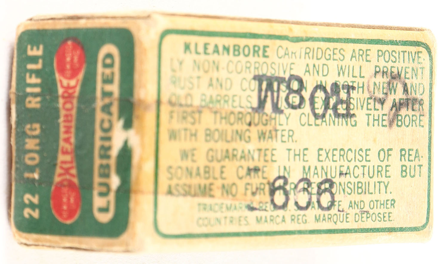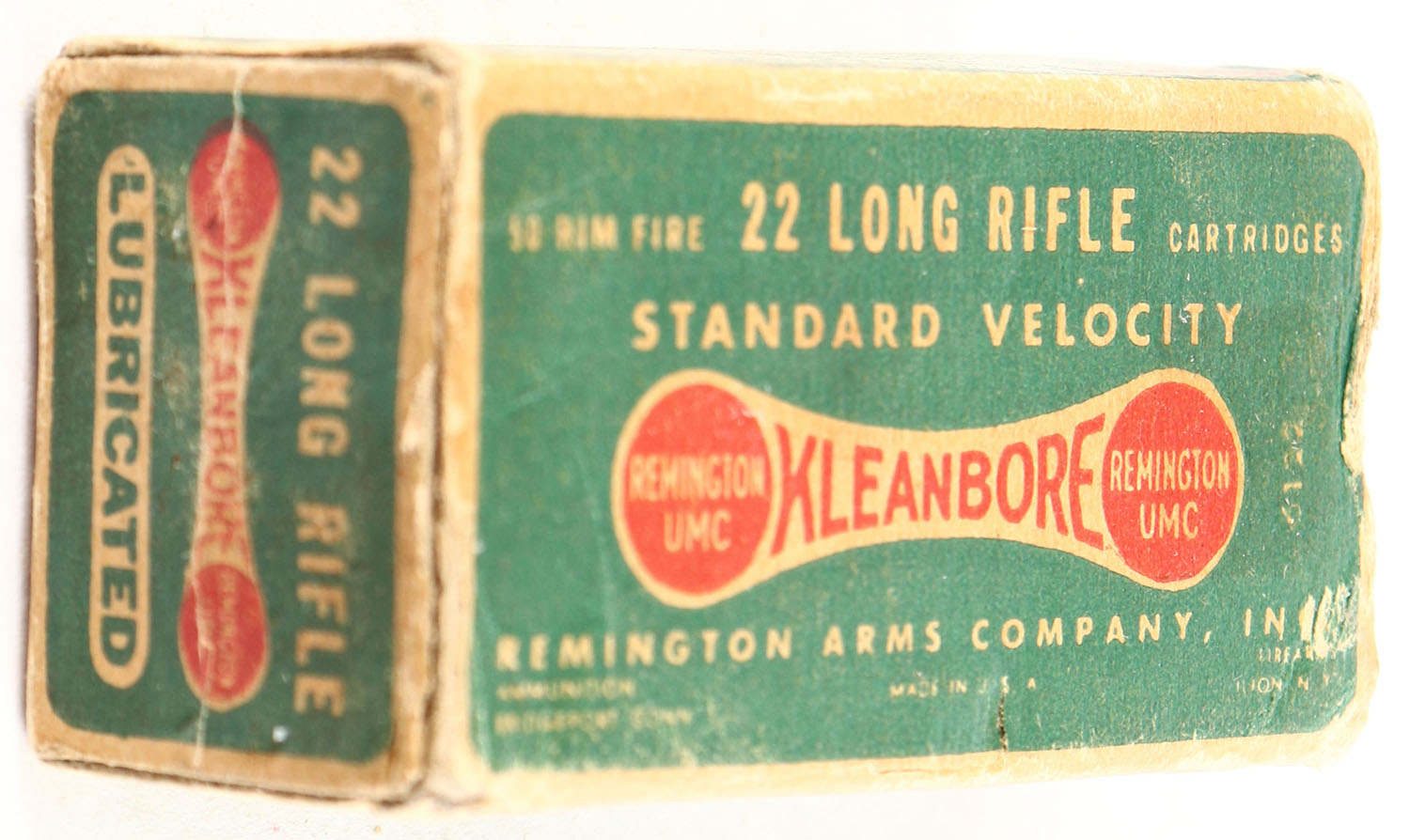 Remington, Kleanbore Standard Velocity, .22 Long Rifle, RHWeb: REM-7.1B LR-4, Full, 1pc. Green buff & red dog bone box, box is solid with very good color, some age soiling, corner wear, partial seam split to left end flap, minor corner wear, edges are mostly solid, ammo is excellent. Grade: Very Good - Value: 6 to 30