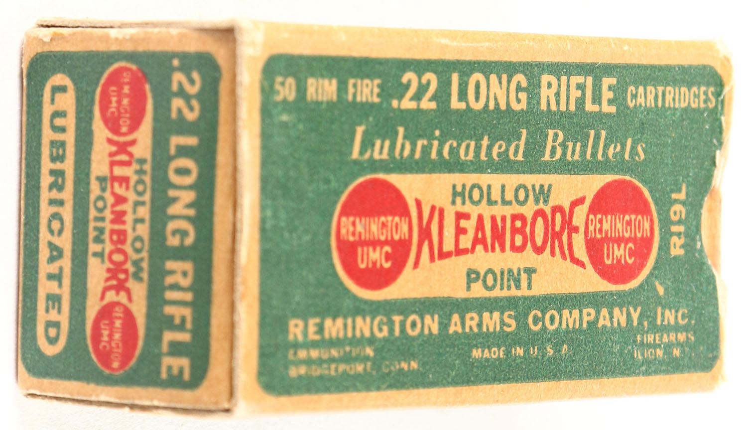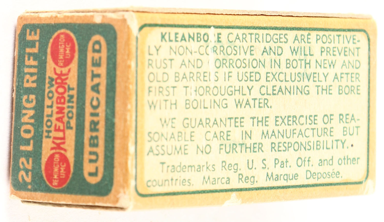 Remington, Kleanbore, .22 Long Rifle Hollow Point, RHWeb: REM-7.2 LR-4 (With ''C'' Bottom), Full, 1pc. Green buff & red box, box is solid with very good color, some age soiling, very minor corner wear, edges are crisp, end flaps are solid, ammo is very good. Grade: Very Good ++ - Value: 20 to 80