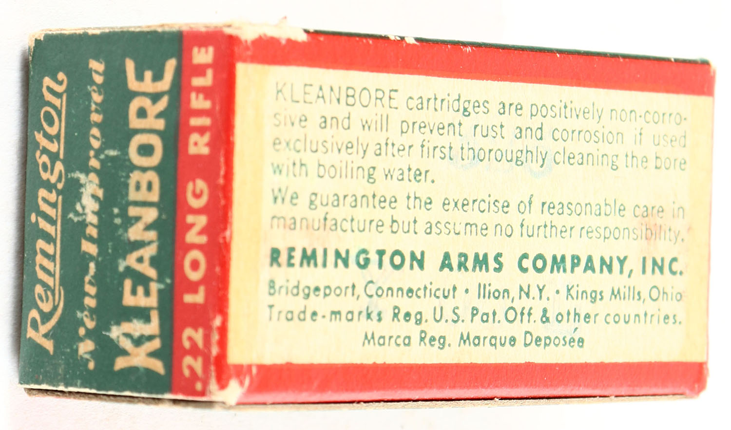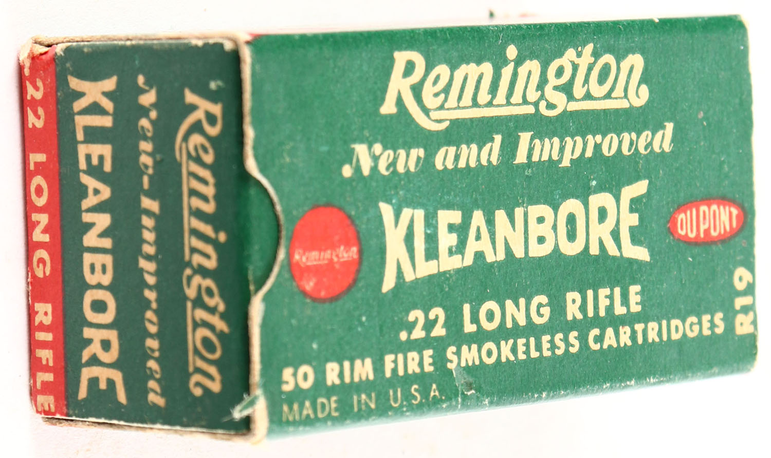 Remington, New and Improved Kleanbore, .22 Long Rifle, RHWeb: REM-11 LR-1, Full, 1pc. Green white & red box, box is solid with excellent color, minor corner wear, edges are mostly crisp, end flaps are solid, ammo is very good to excellent. Grade: Excellent + - Value: 10 to 50