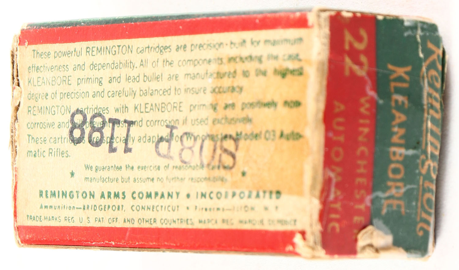 Remington, Kleanbore, .22 Winchester Automatic, RHWeb: REM-12 WA-1a, Full, 1pc. Green white & red box, both end flaps are torn, very good color, some age soiling, corner wear, minor edge wear, ammo is excellent. Grade: Good ++ - Value: 8 to 40