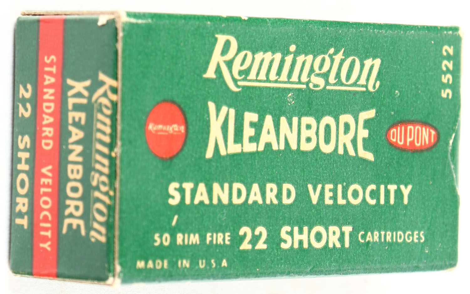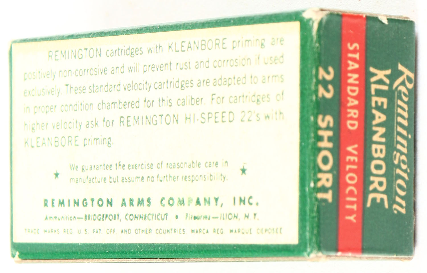 Remington, Kleanbore Standard Velocity, .22 Short, RHWeb: REM-12 S-2a, Full, 1pc. Green white & red box, box is solid with excellent color, very minor age soiling & corner wear, edges are crisp, end flaps are solid, ammo is excellent. Grade: Excellent + - Value: 8 to 40