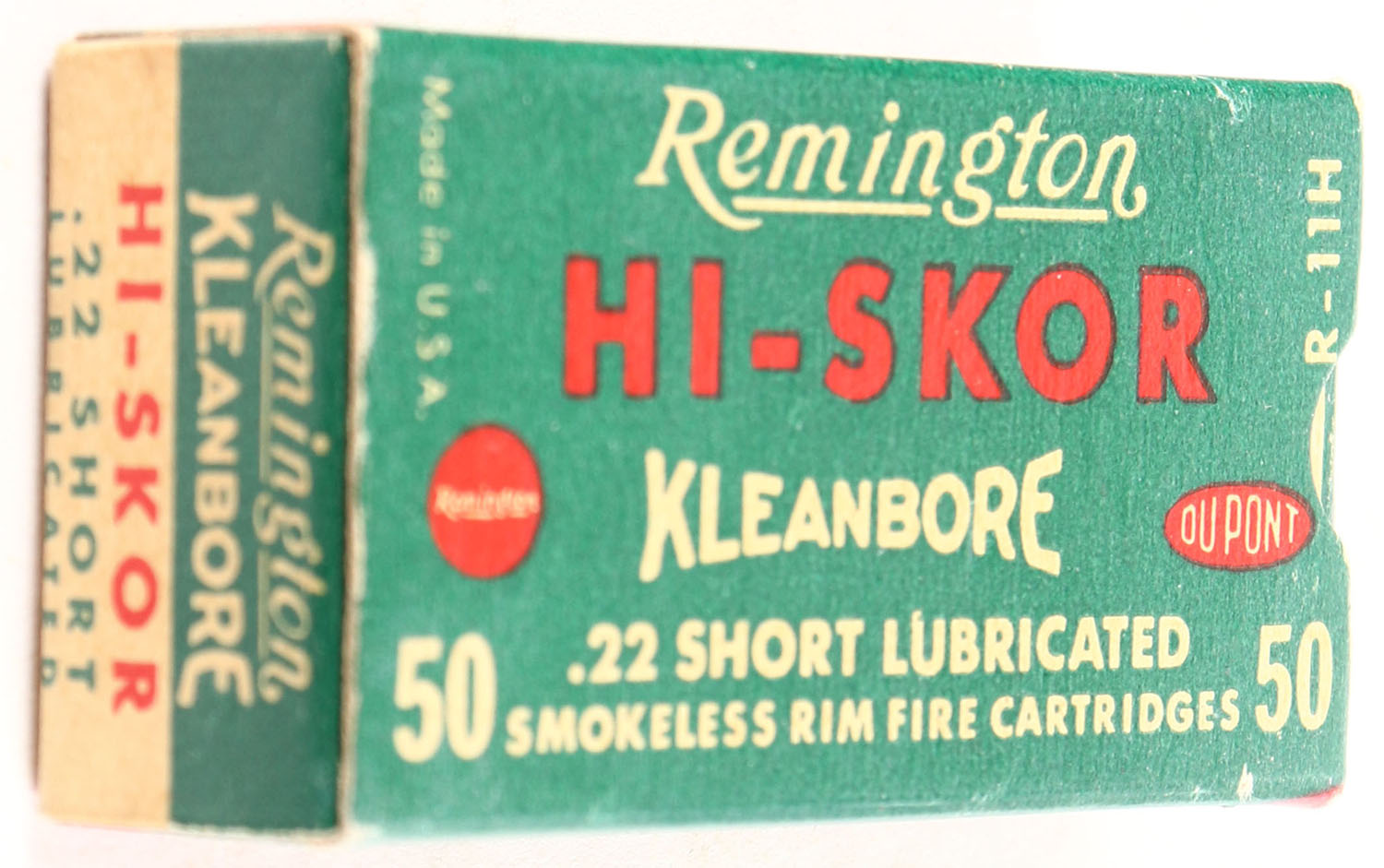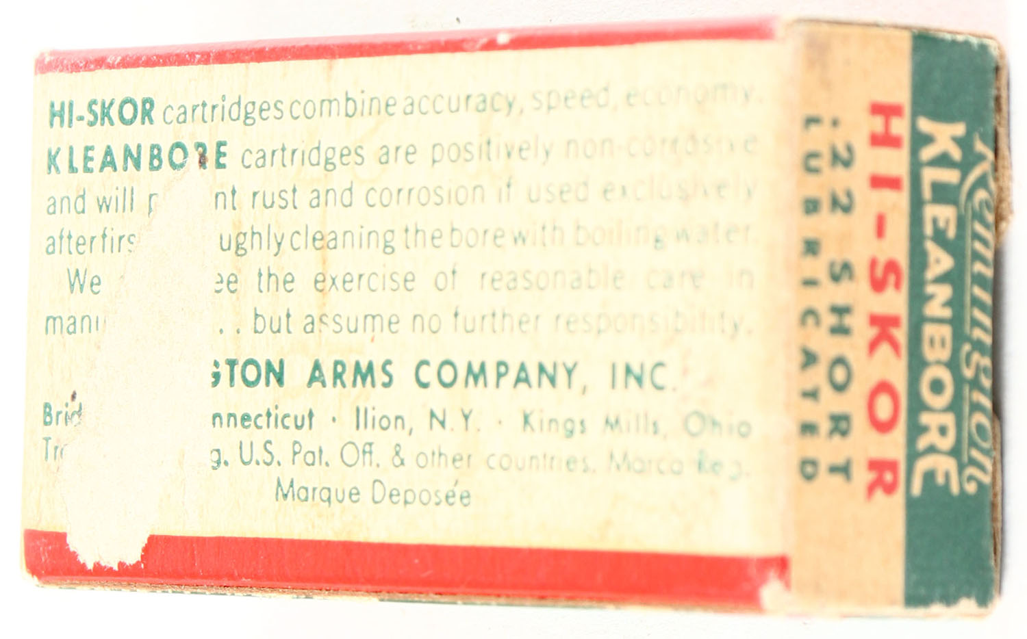 Remington, Hi-Skor, .22 Short, RHWeb: REM-53 S-1b, Partial 49rds., 1pc. Green white & red box, box is solid with excellent color, very minor corner wear, edges are crisp, end flaps are solid, ammo is very good. Grade: Excellent + - Value: 10 to 50