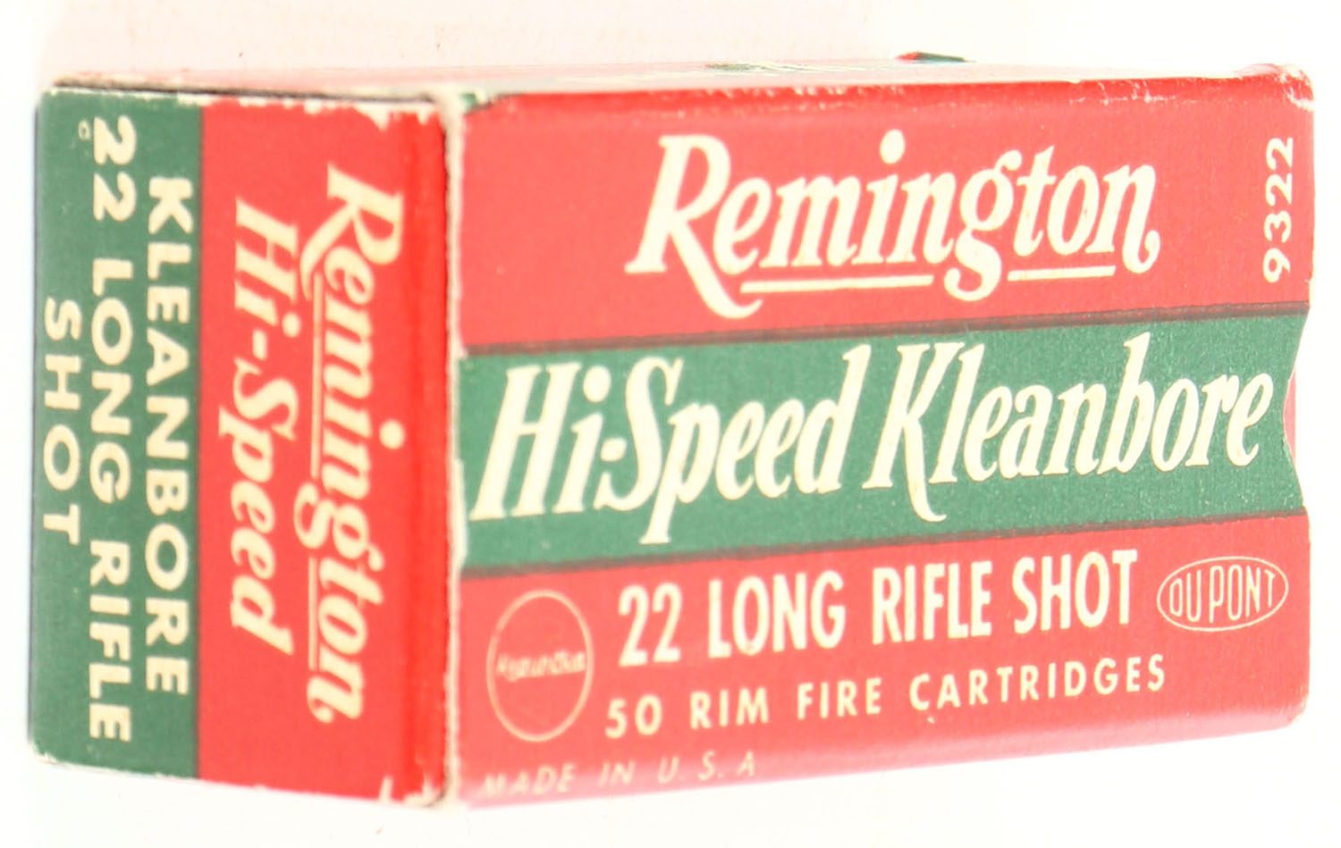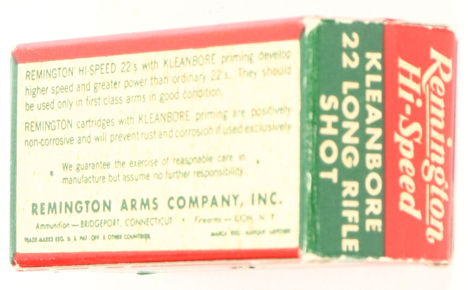 Remington, Hi-Speed Kleanbore, .22 Long Rifle Shot, RHWeb: REM-14 LR-5c, Full, 1pc. Red green & white box, box is solid with excellent color, very minor age soiling & corner wear, edges are crisp, end flaps are solid, ammo is minty. Grade: Excellent ++ - Value: 20 to 60