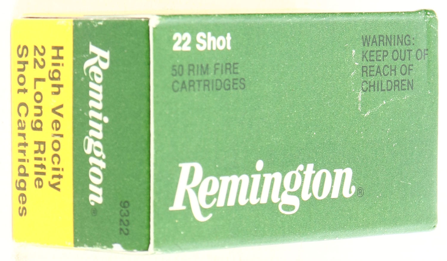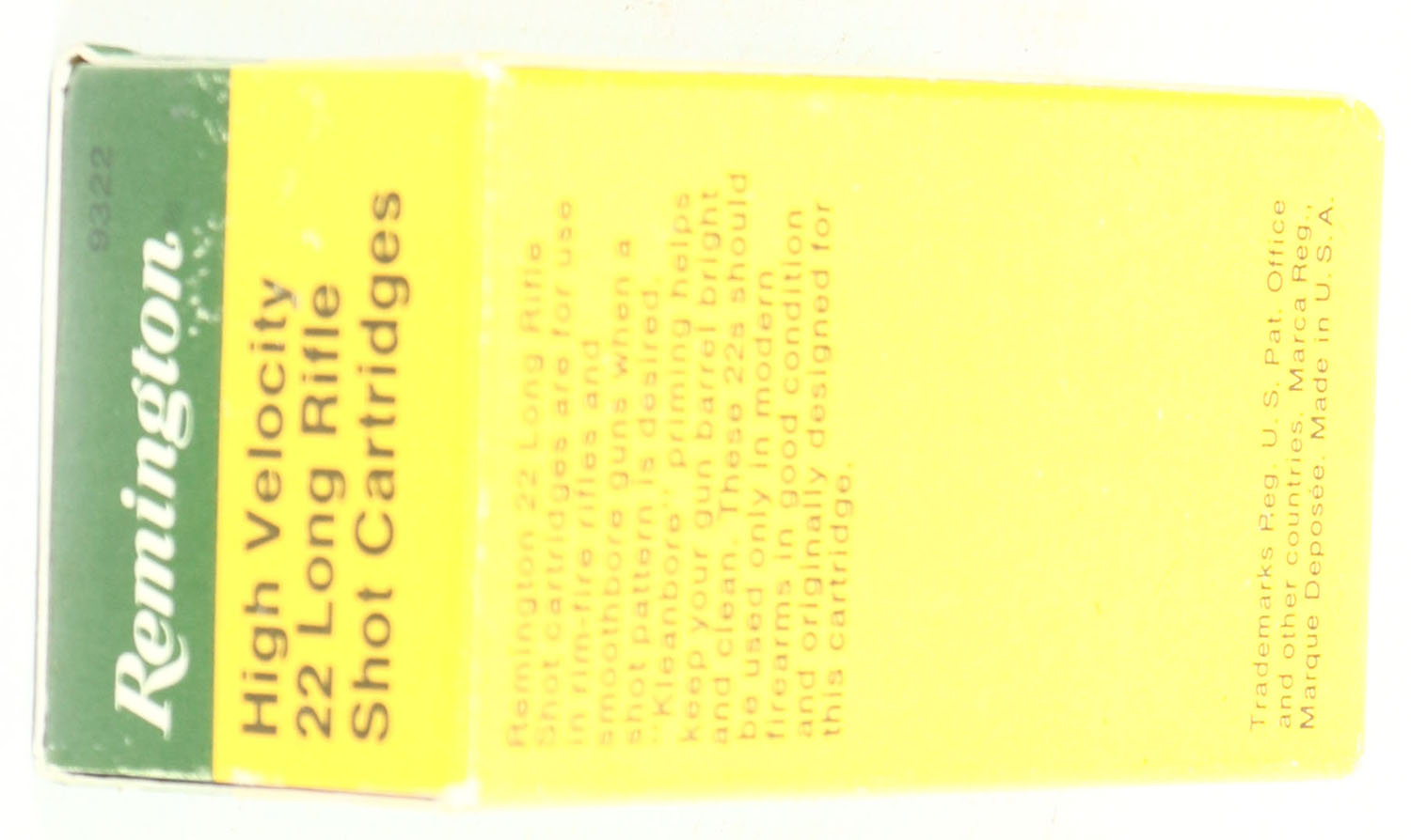 Remington, High Velocity, .22 Long Rifle Shot, RHWeb: REM-19 LR-5, Full, 1pc. Green & yellow box, box is MINT with minty color, corners are sharp, edges are crisp, end flaps are solid, ammo is excellent. Grade: MINT - Value: 8 to 40