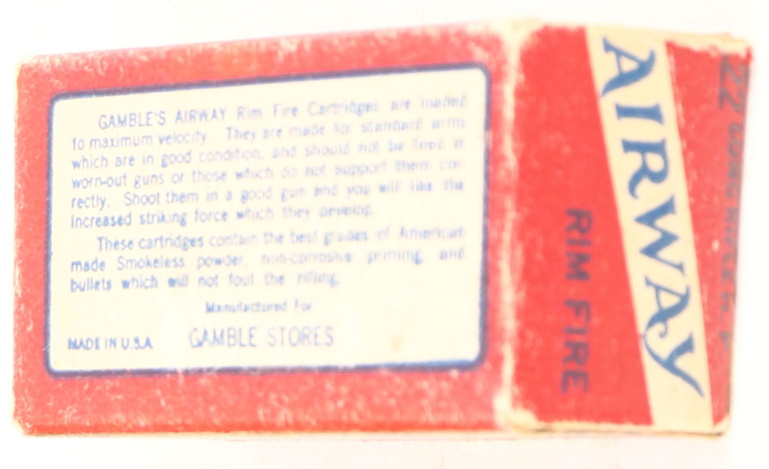 Gambles, Airway, .22 Long Rifle Hollow Point, RHWeb: GS-1 LR-2a, Full, 1pc. Red blue & white box, box is solid with excellent color, minor age soiling & shelf wear, minor edge & corner wear, end flaps are solid, ammo is excellent. Grade: Excellent - Value: 50 to 150
