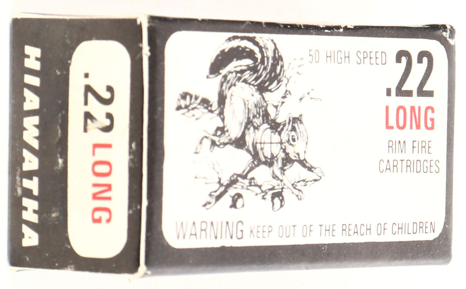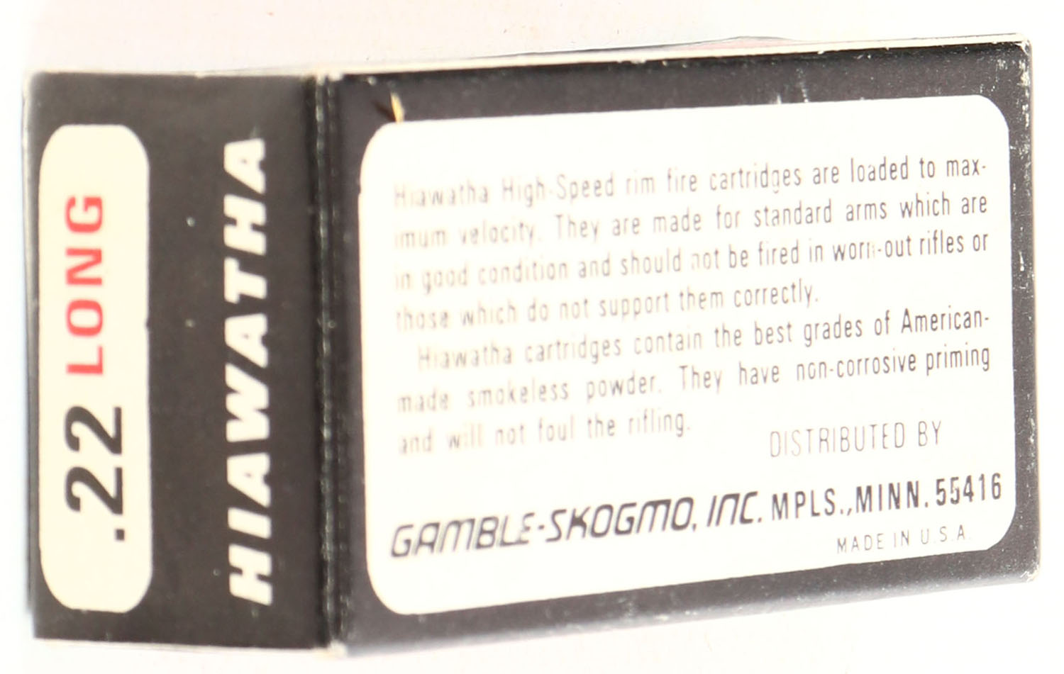 Gambles, Hiawatha, .22 Long, RHWeb: GS-5 L-1a, Full, 1pc. White red & black box, box is solid with excellent color, very minor corner wear, edges are mostly crisp, end flaps are solid, ammo is excellent. Grade: Excellent + - Value: 30 to 90