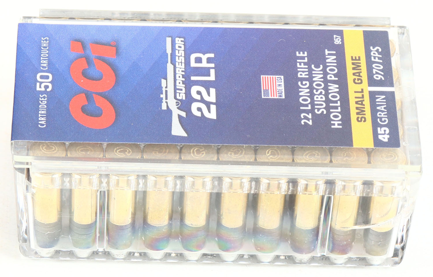 CCi, Suppressor, .22 Long Rifle Hollow Point, Subsonic, 45 Grain, 970 FPS, FULL & SEALED, 2pc. Clear plastic tray with blue sealing label, box is MINT with mint color, label is mint, ammo appears mint. Grade: MINT - Value: 10 to 40