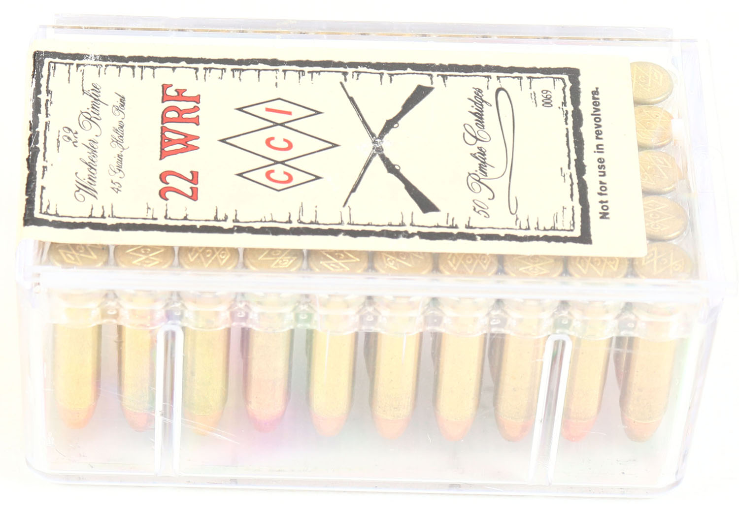 CCi, .22 WRF Hollow Point, FULL & SEALED, 2pc. Clear plastic tray with tan sealing label, box and label are mint, ammo appears minty. Grade: MINT - Value: 10 to 40
