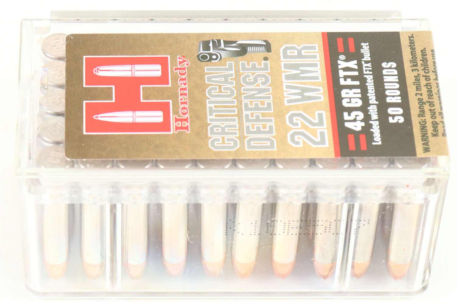 Hornady Critical Defense, .22 Mag, 45 Gr. FTX, 1700 FPS from 24'' barrel, 1000 FPS from 1 7/8'' barrel, FULL & SEALED, 2pc. Clear plastic tray with red & black sealing label, box is MINT with mint color, label is mint, ammo appears mint. Grade: MINT - Value: 16 to 32