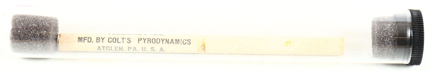 Colt's Pyrodynamics, Teleshot - 22, .22 Long Rifle, Not in RHWeb, FULL & SEALED, buff paper tube with black printing, tube is solid with very good to excellent color, minor age soiling, some staining, comes in glass protective tube. Grade: Excellent - Value: 20 to 200