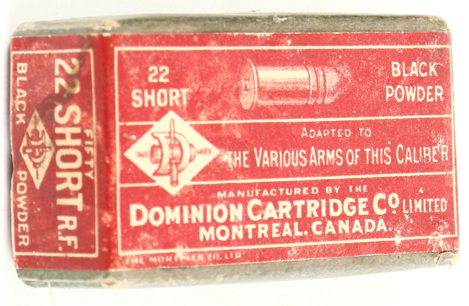Dominion, Black Powder, .22 Short, RHWeb: D-3 S-2a, FULL & SEALED, 2pc. Green box with red & white wraparound label, box is solid with excellent color, some shelf wear, minor corner wear, edges are crisp, label is intact. Grade: Excellent + - Value: 100 to 300