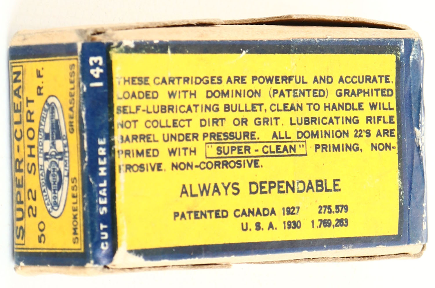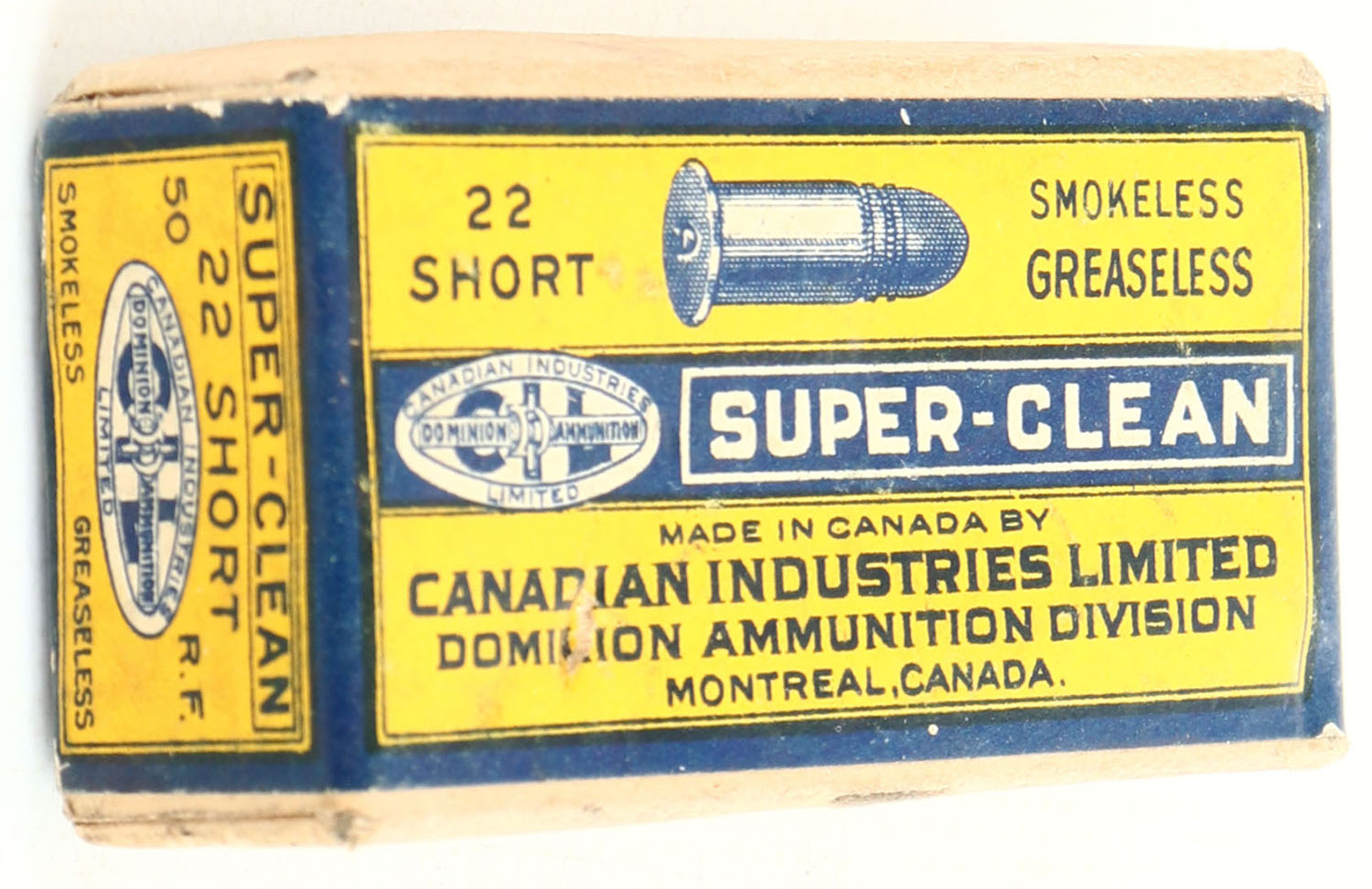 C.I.L., Super-Clean, .22 Short, Smokeless Greaseless, RHWeb: CIL-2 S-2, FULL & SEALED, 2pc. Buff box with yellow & blue wraparound label, box is solid with excellent color, very small puncture on top, stain on front, very minor corner wear, edges are crisp, label is intact. Grade: Excellent - Value: 50 to 150