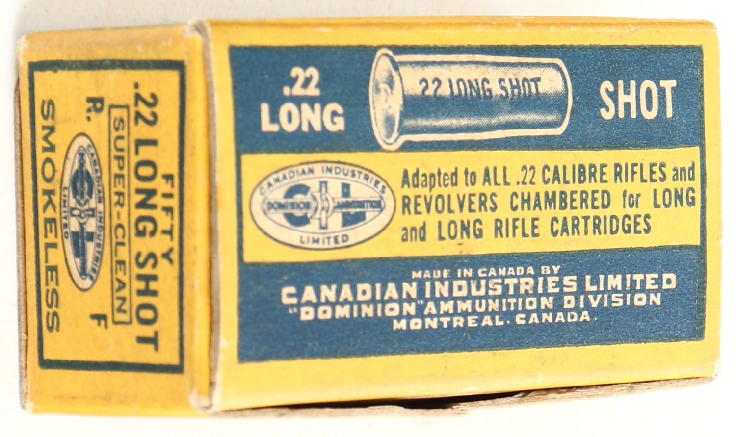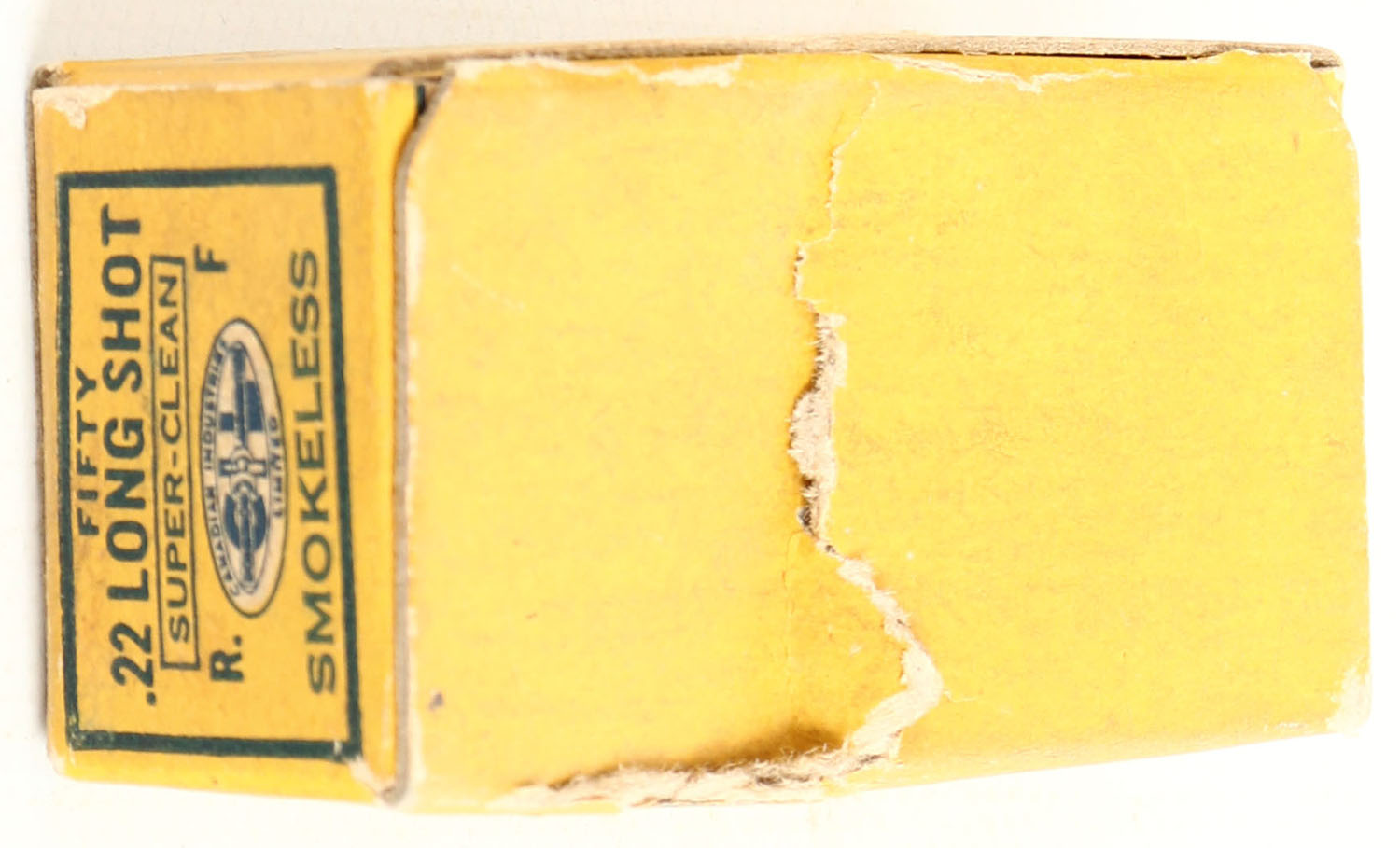 C.I.L., Super-Clean, .22 Long Shot, Smokeless, RHWeb: CIL-2 L-6, Partial 25rds., 1pc. Yellow & blue box, box is solid with excellent color, very minor age soiling, bottom is torn, corners are mostly sharp, edges are crisp, top flap is solid, ammo is excellent. Grade: Very Good - Value: 2 to 50