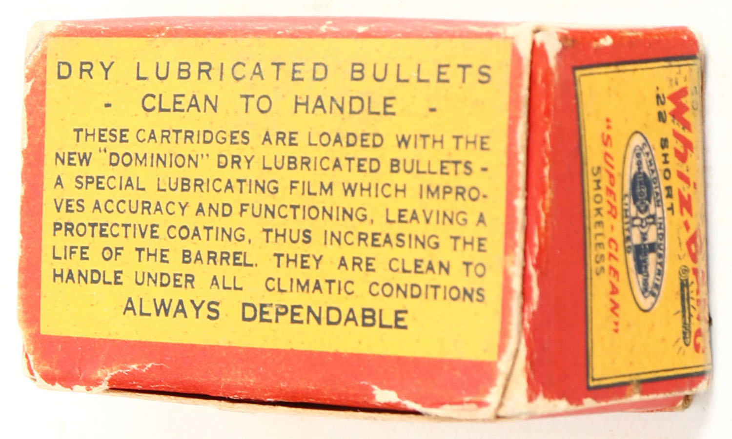 C.I.L., Whiz-Bang, .22 Short, Super-Clean, RHWeb: CIL-2 S-4b, Full, 1pc. Yellow red & blue box, box is solid with very good to excellent color, minor age soiling & corner wear, very minor edge wear, top flap is solid, ammo is excellent. Grade: Excellent + - Value: 2 to 60