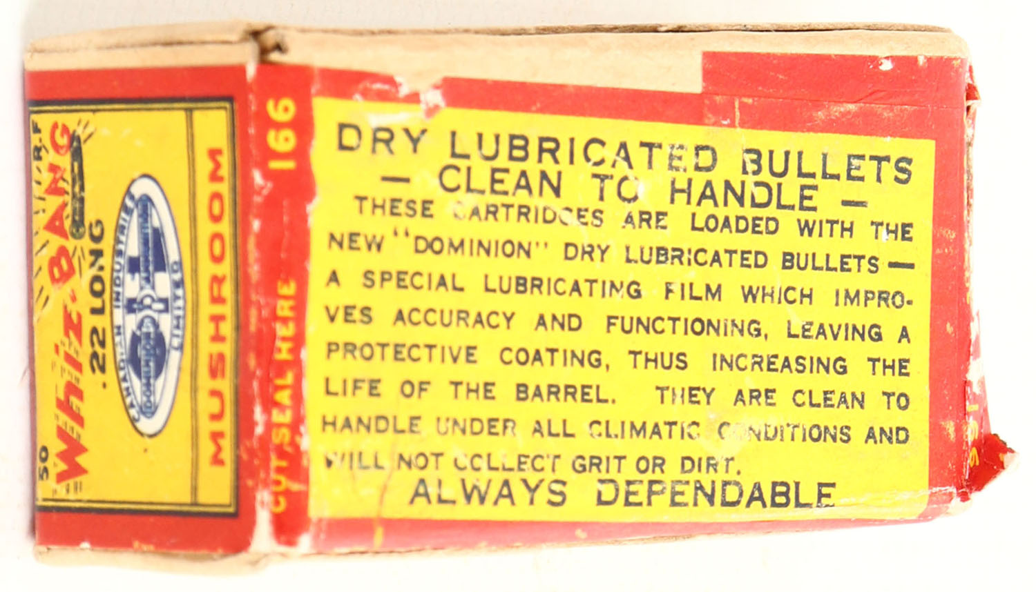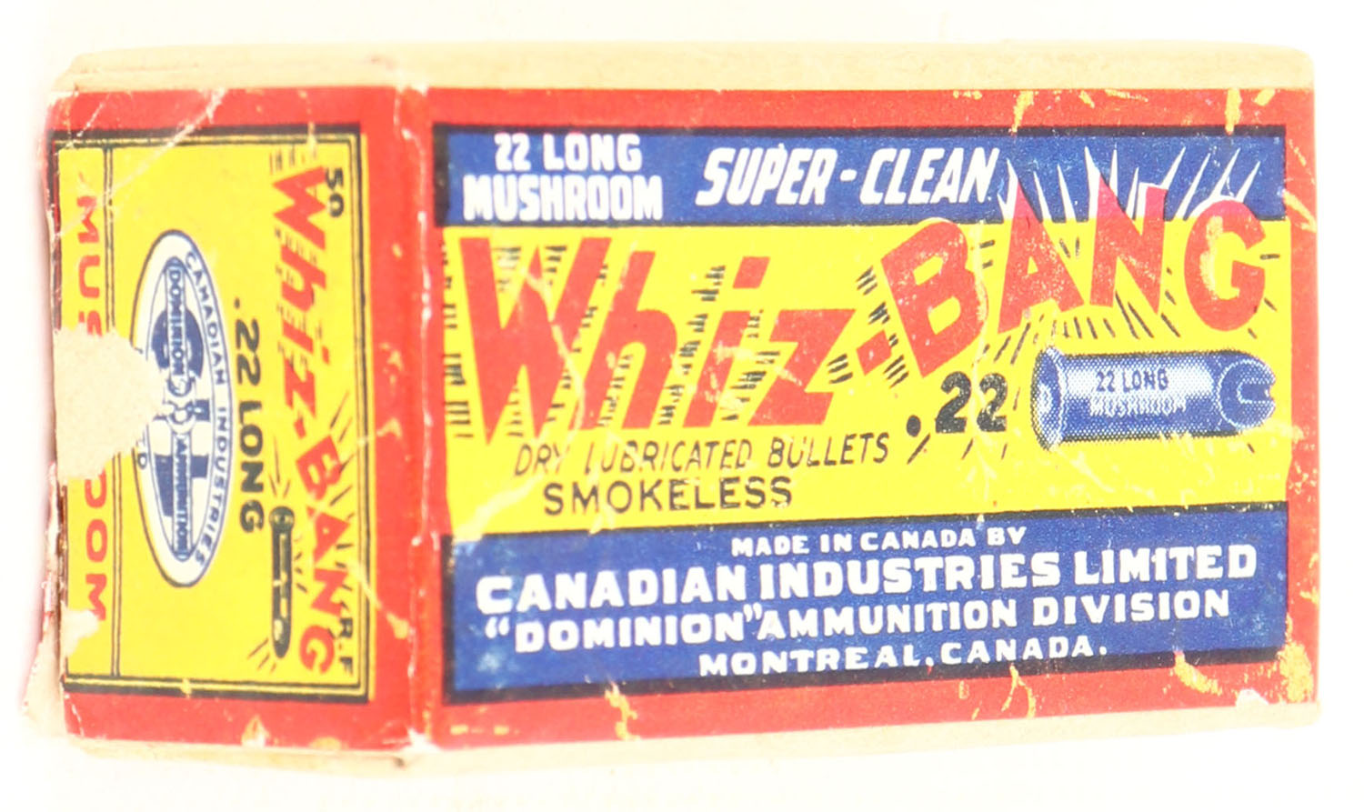 C.I.L., Whiz-Bang, .22 Long Mushroom, Super-Clean, RHWeb: CIL-2 L-4a, Full, 2pc. Buff box with yellow red & blue wraparound label, box is solid with excellent to minty color, very minor corner wear, edges are crisp, label is intact & sealed at right end, ammo is excellent to minty. Grade: Excellent ++ - Value: 80 to 240