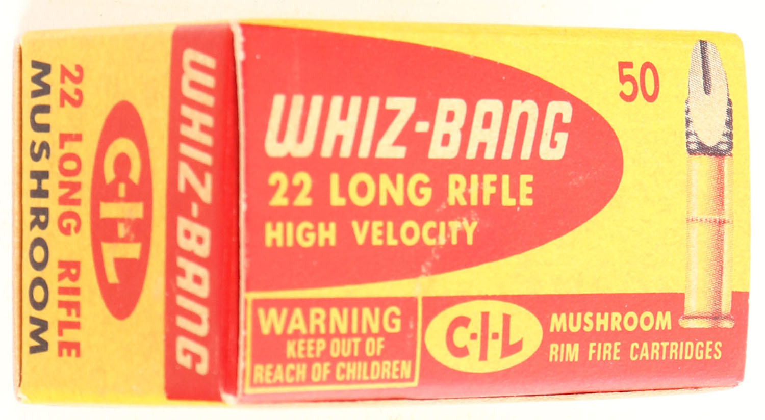 C.I.L., Whiz-Bang, .22 Long Rifle Mushroom, RHWeb: CIL-5 LR-2, Full, 1pc. Yellow & red box, box is MINT with minty color, corners are sharp, edges are crisp, top flap is solid, ammo is excellent. Grade: MINT - Value: 10 to 50