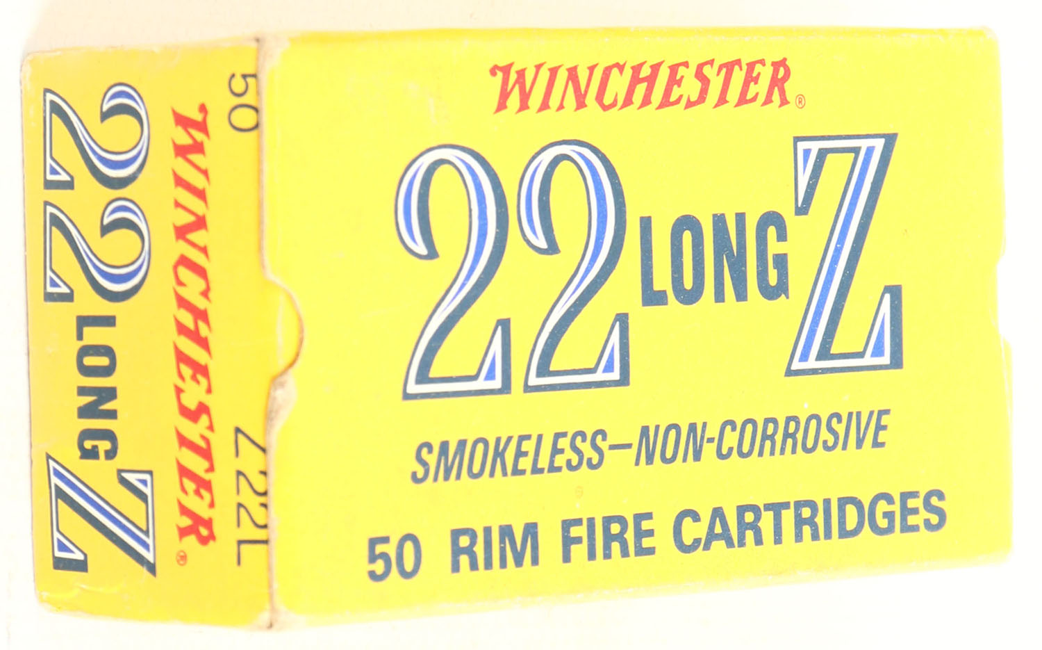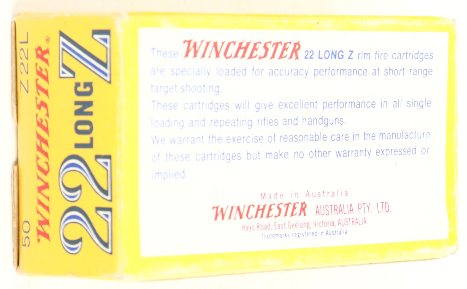 Winchester, 22 Long Z, .22 Long, RHWeb: (Australia) LZ-1 L-1a, Full, 1pc. Yellow box, box is solid with excellent color, very minor corner wear, edges are crisp, end flaps are solid, ammo is excellent. Grade: Excellent + - Value: 40 to 120