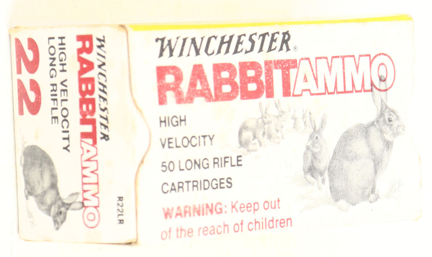 Winchester, Rabbit Ammo, .22 Long Rifle, RHWeb: (Australia) RABBIT-1 LR-1a, Full, 1pc. White & yellow box, box is solid with very good color, minor age soiling, very minor corner wear, edges are crisp, end flaps are solid, ammo is minty. Grade: Excellent - Value: 20 to 60