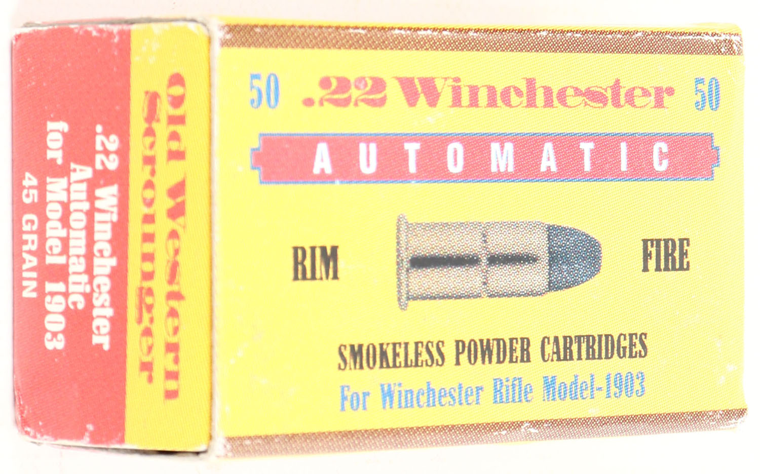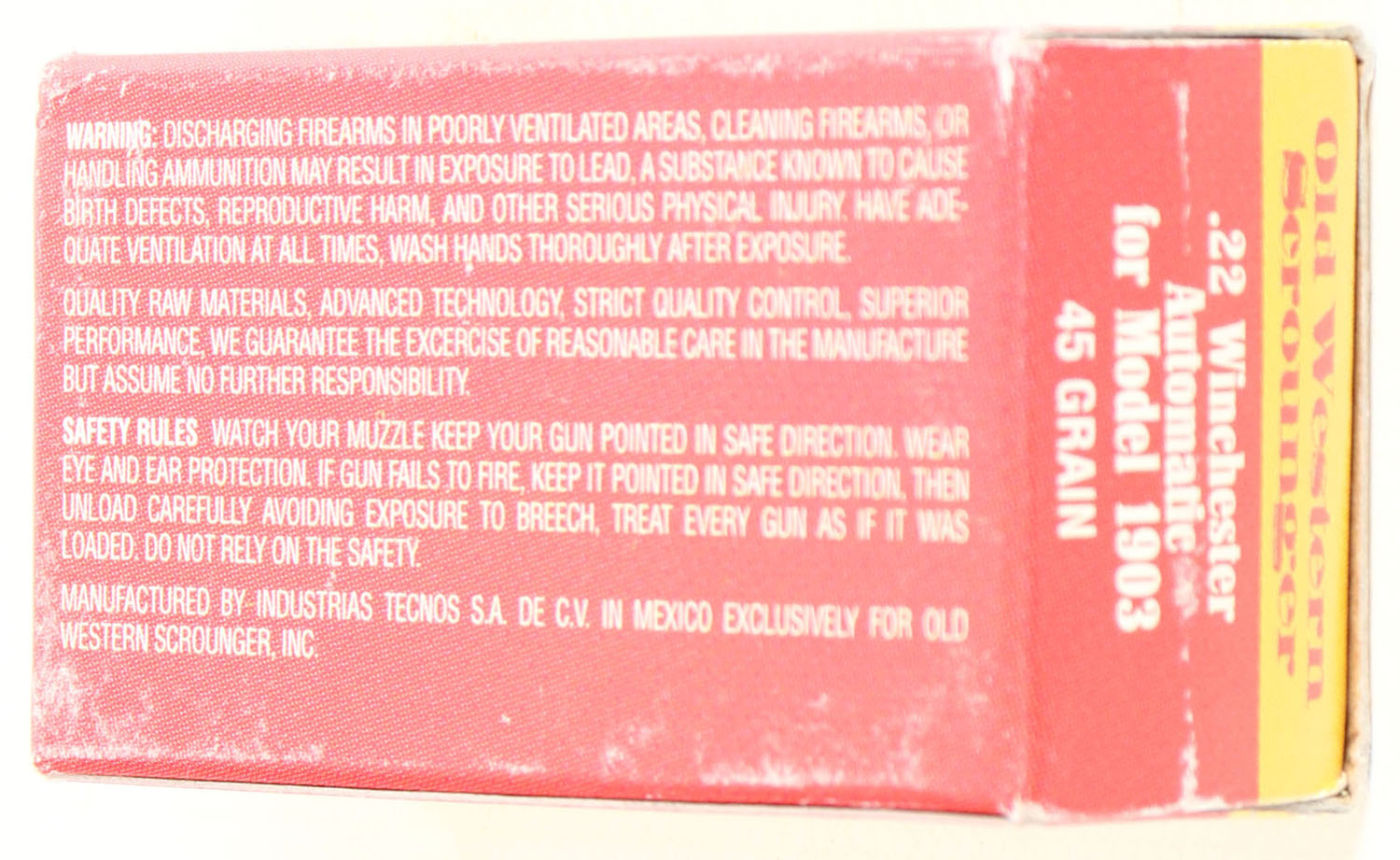 Old Western Scrounger, .22 Winchester Automatic, RHWeb: IT-10 WA-1, Full, 1pc. Yellow & red box, box is mint with mint color, sharp corners, crisp edges, rigid end flaps, ammo is mint. Grade: Mint - Value: 20 to 40