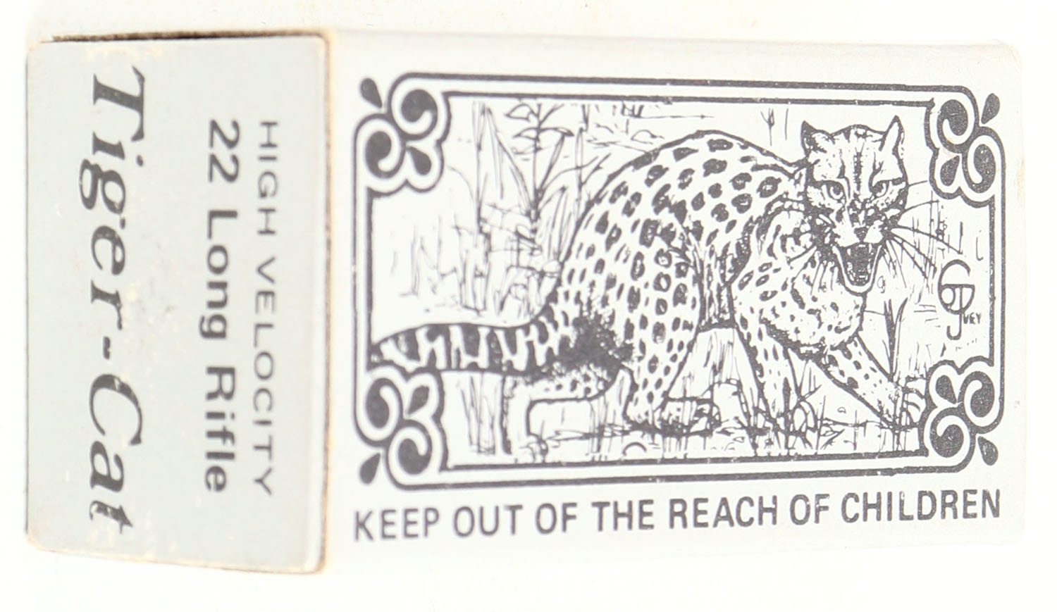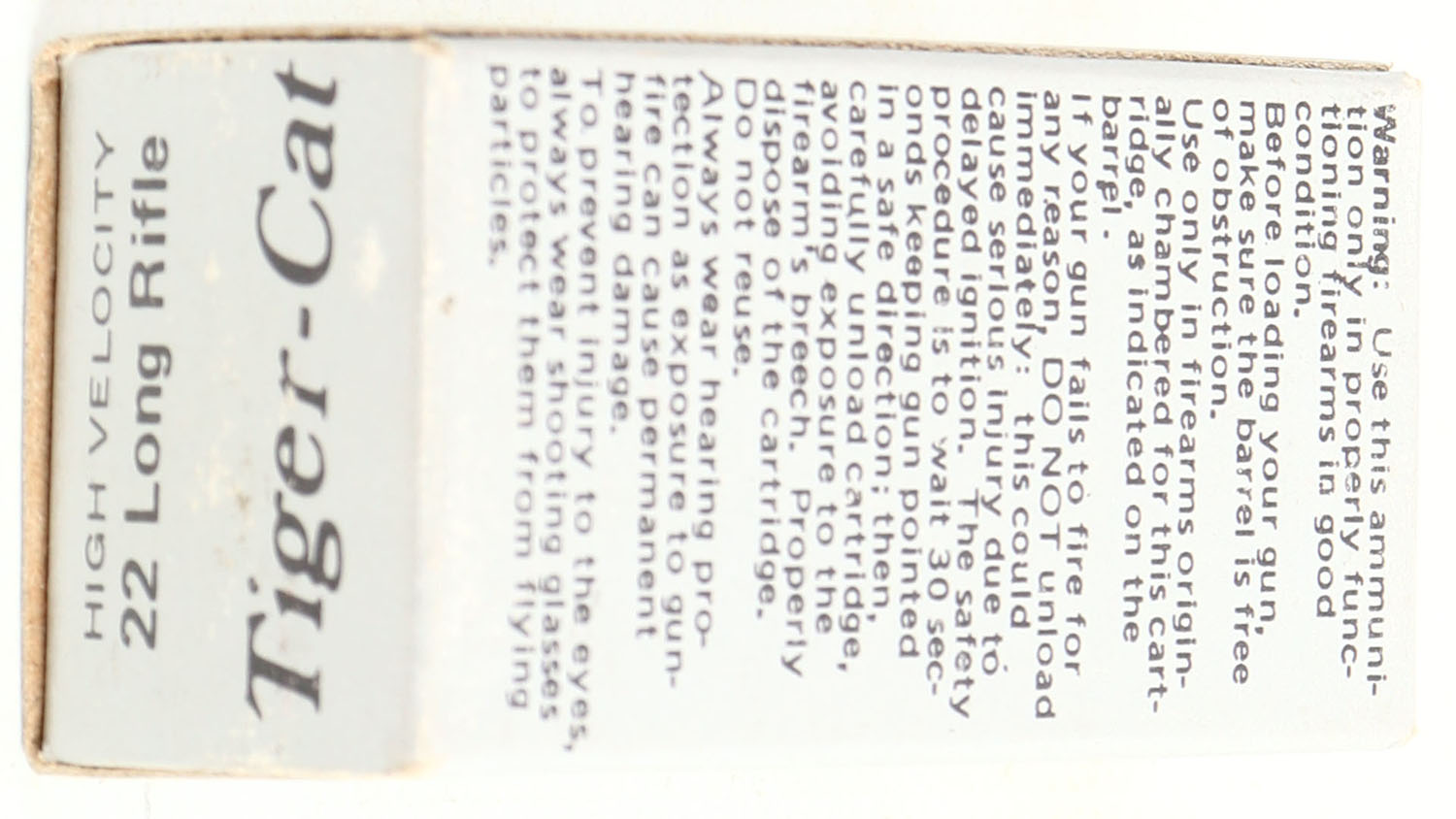 Sovereign, Tiger-Cat, .22 Long Rifle, High Velocity, RHWeb: SGD-1 LR-1a, Full, 1pc. Silver & black box, box is near mint with minty color, only very minor shelf wear, corners are sharp, edges are crisp, end flaps are solid, ammo is excellent to minty. Grade: Excellent ++ - Value: 30 to 90