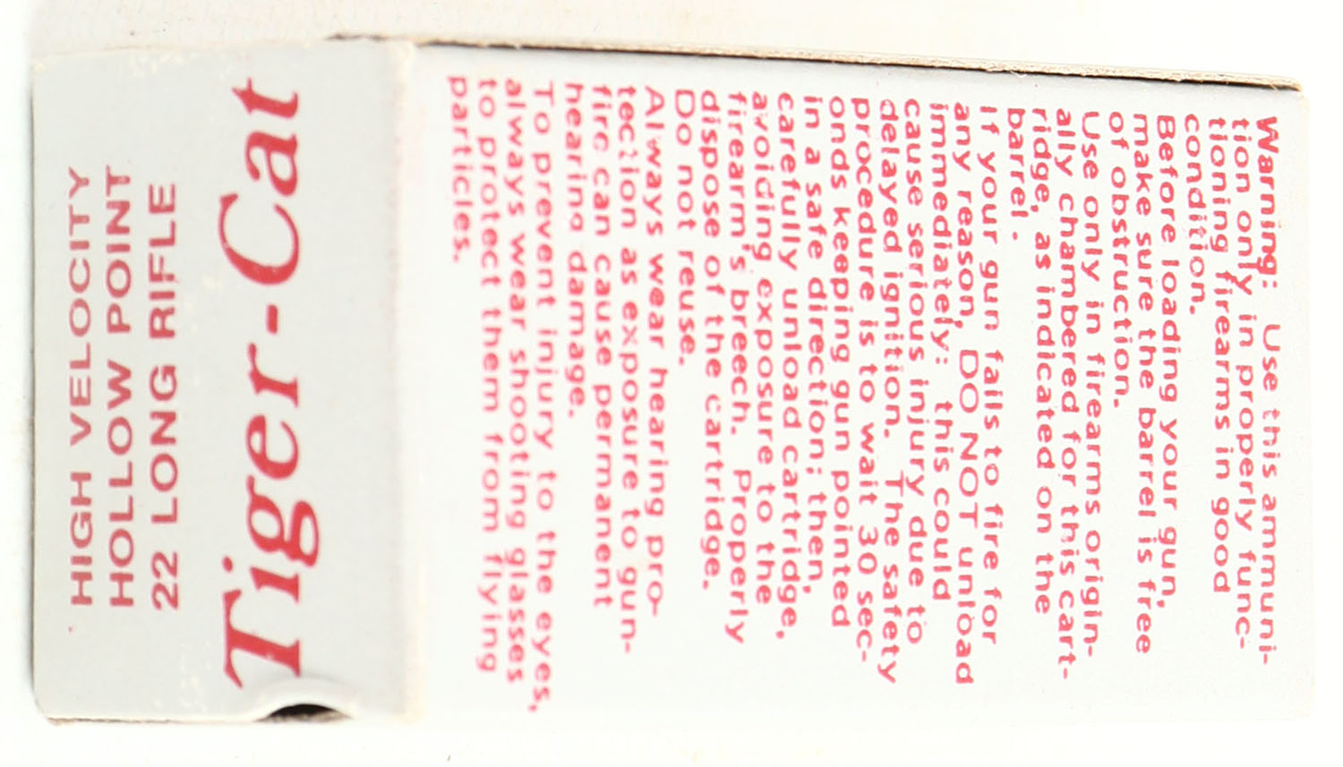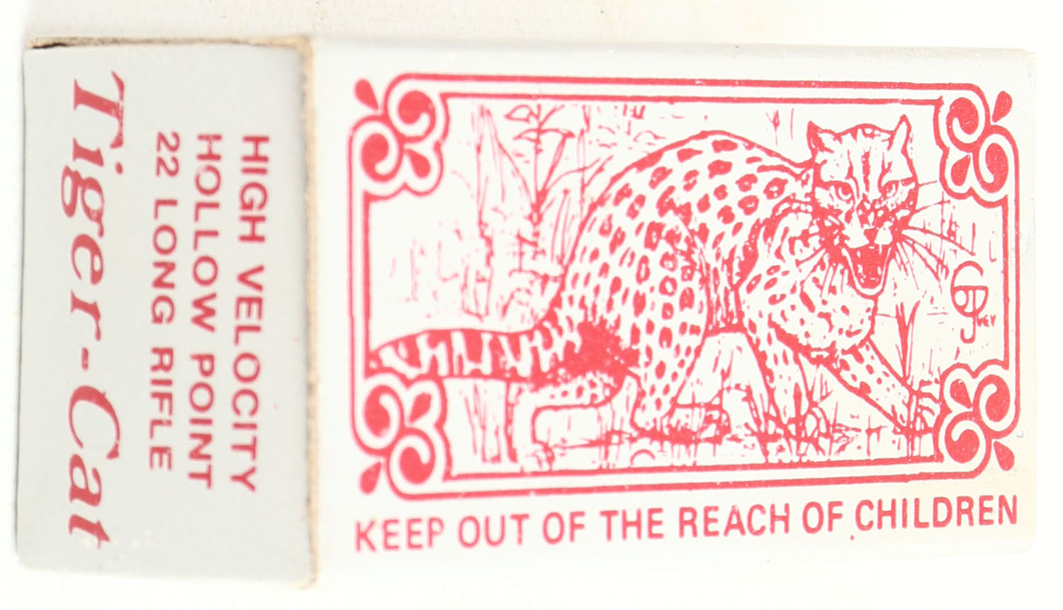 Sovereign, Tiger-Cat, .22 Long Rifle Hollow Point, RHWeb: SGD-1 LR-2, Full, 1pc. Silver & red box, box is near mint with minty color, only very minor wear to right end flap, corners are sharp, edges are crisp, end flaps are solid, ammo is minty. Grade: Excellent ++ - Value: 30 to 90