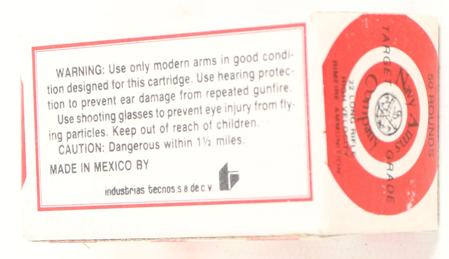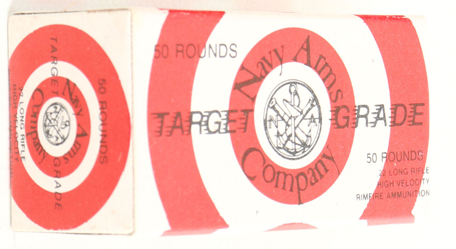 Navy Arms Co., Target Grade, .22 Long Rifle, RHWeb: NA-1 LR-5, Full, 1pc. White & red box, box is solid with excellent color, very minor age soiling, corners are sharp, edges are crisp, end flaps are solid, ammo is excellent. Grade: Excellent + - Value: 10 to 40