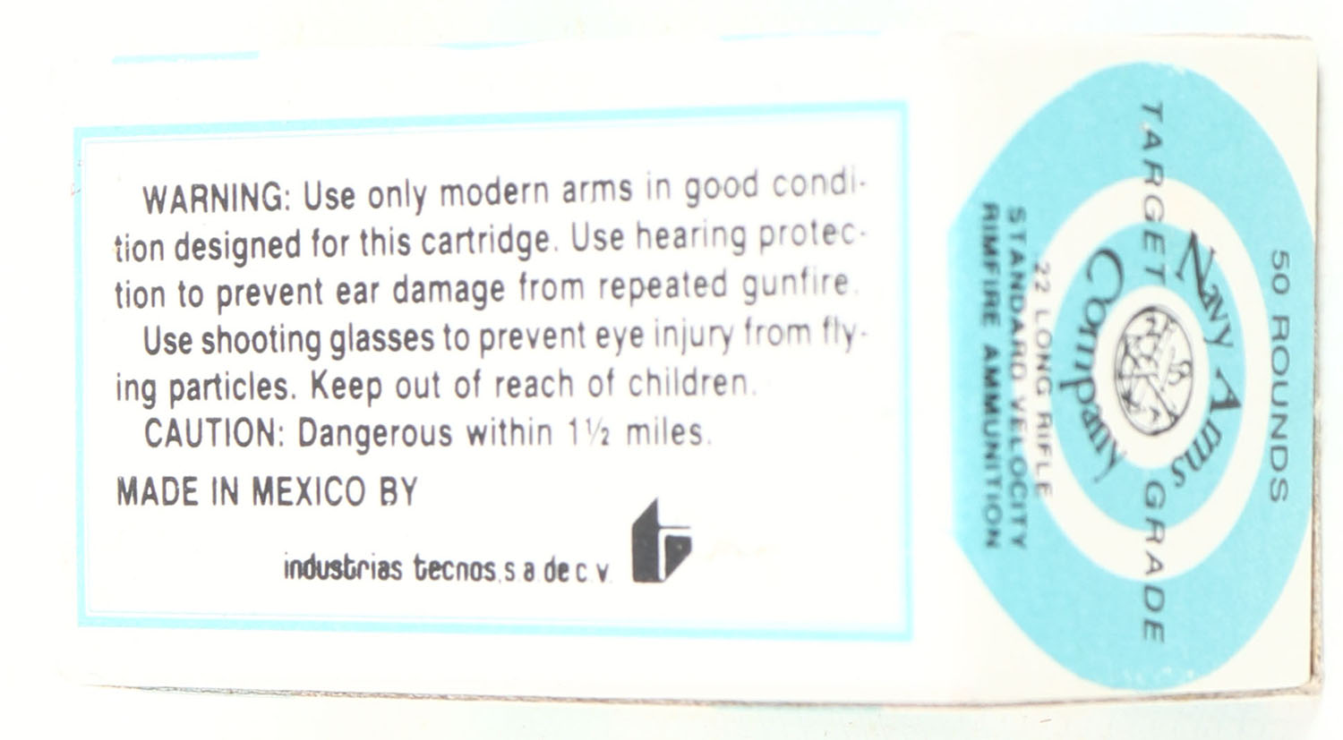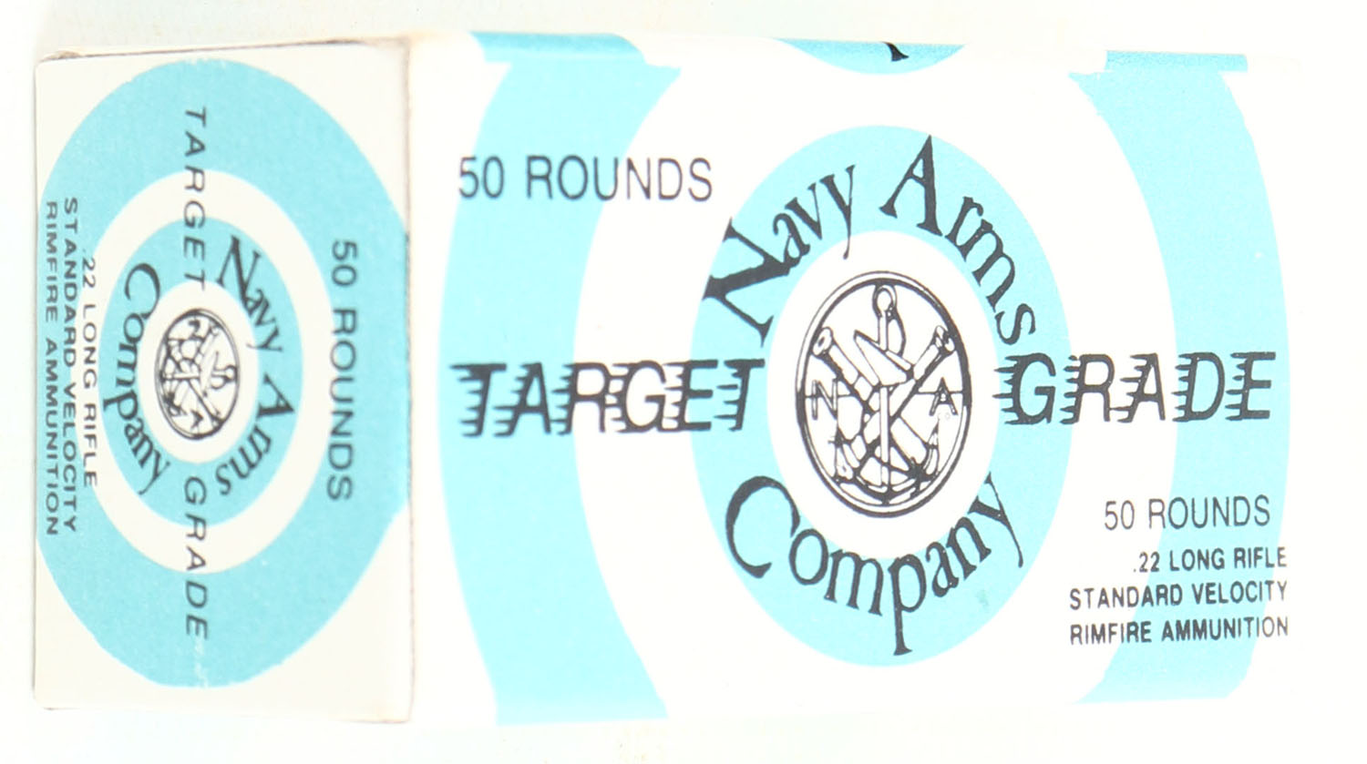 Navy Arms Co., Target Grade, .22 Long Rifle, RHWeb: NA-1 LR-5, Full, 1pc. White & blue box, box is MINT with minty color, corners are sharp, edges are crisp, end flaps are solid, ammo is excellent. Grade: MINT - Value: 10 to 40