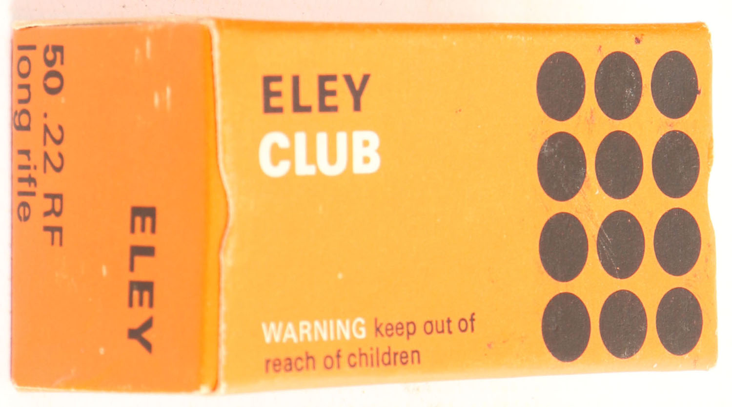 Eley, Club, .22 Long Rifle, RHWeb: (England) IMI-2 LR-19d, Full, 1pc. Orange & black box, box is near mint with excellent to minty color, only very minor age soiling, corners are sharp, edges are crisp, end flaps are solid, ammo is excellent. Grade: Excellent ++ - Value: 8 to 40
