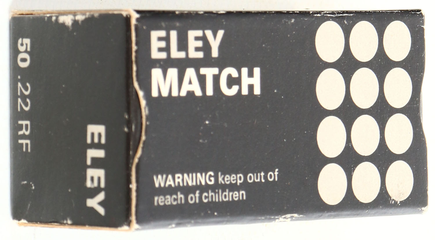 Eley, Match, .22 Long Rifle, RHWeb: (England) IMI-2 LR-2a, Full, 1pc. Black & gray box, box is solid with excellent color, very minor edge & corner wear, end flaps are solid, ammo is excellent. Grade: Excellent + - Value: 8 to 40