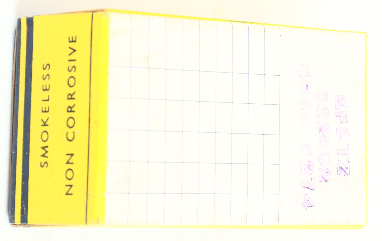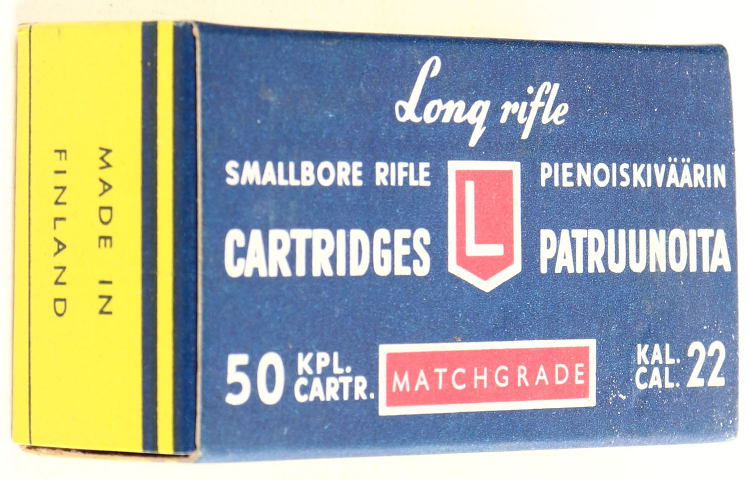 Lapua, Match Grade, .22 Long Rifle, RHWeb: (Finland) L-3 LR-4, Full, 1pc. Blue yellow & red box, box is near mint with minty color, only very minor age soiling on bottom, corners are sharp, edges are crisp, end flaps are solid, inside tray is intact, ammo is excellent. Grade: Excellent ++ - Value: 10 to 50