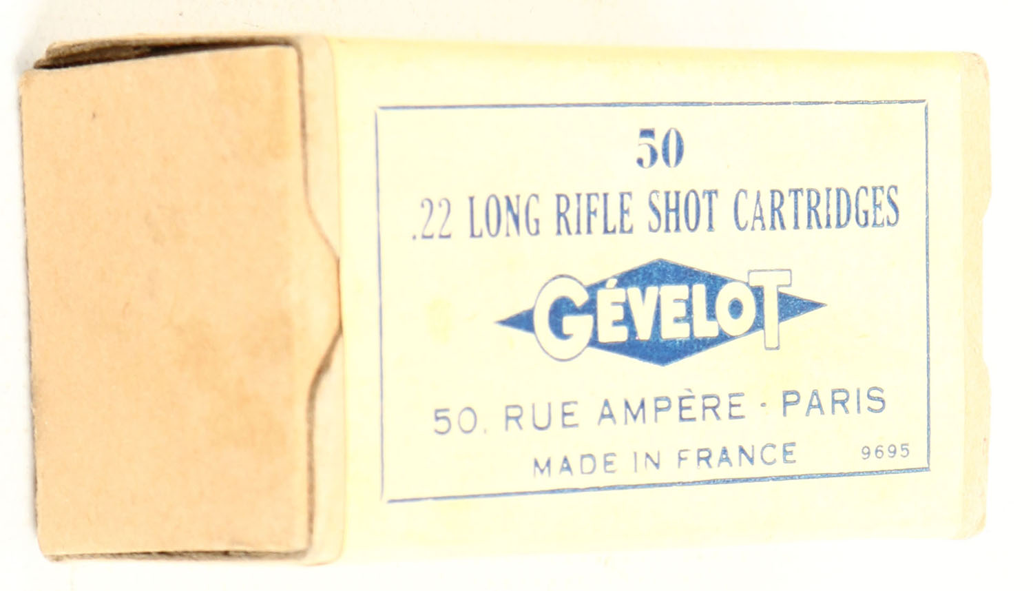 Gevelot, .22 Long Rifle Shot, RHWeb: (France) G-5.5 LR-5, Full, 1pc. Buff box with cream & blue label, box is solid with excellent color, very minor age soiling, corners are mostly sharp, edges are crisp, end flaps are solid, ammo is minty. Grade: Excellent ++ - Value: 20 to 60