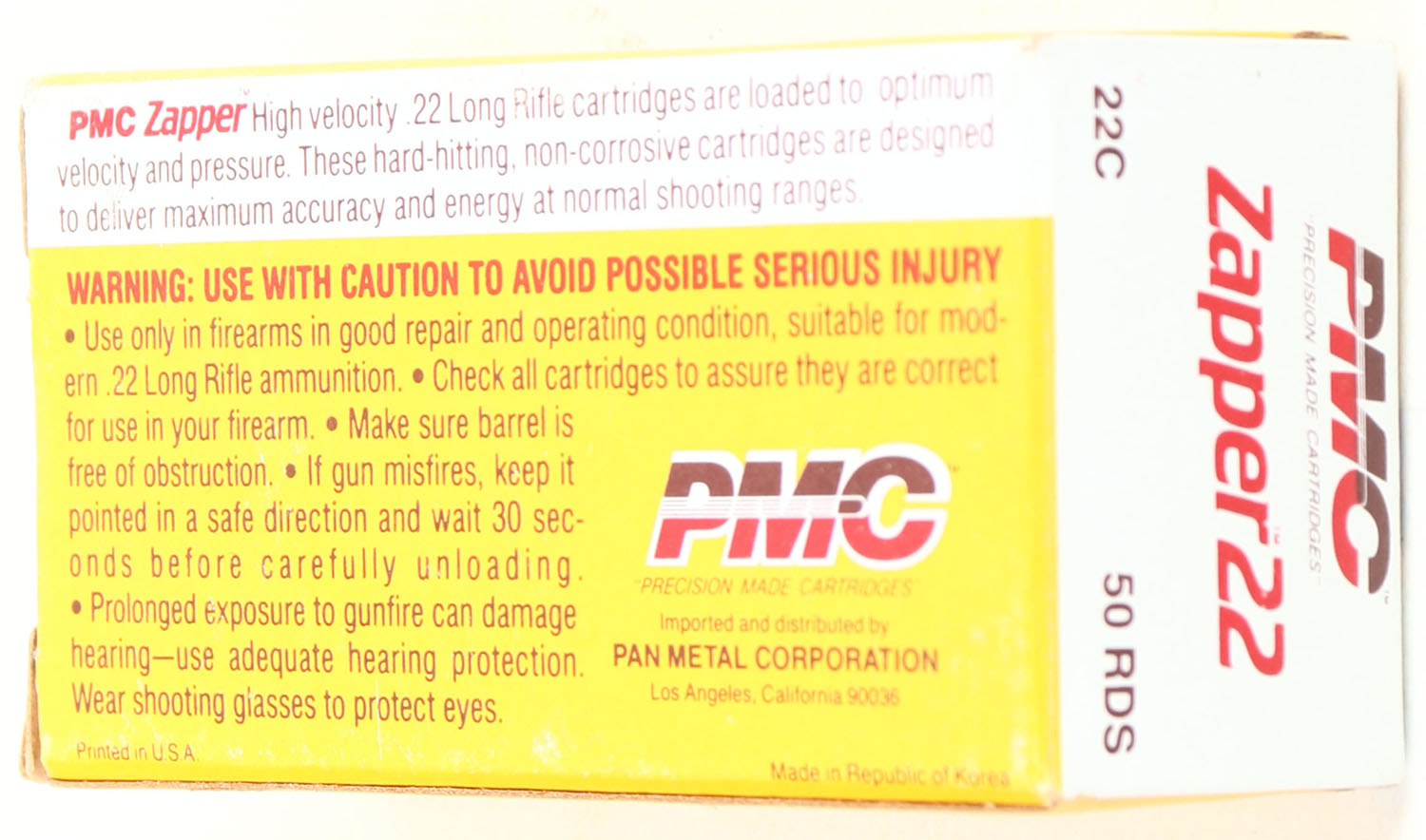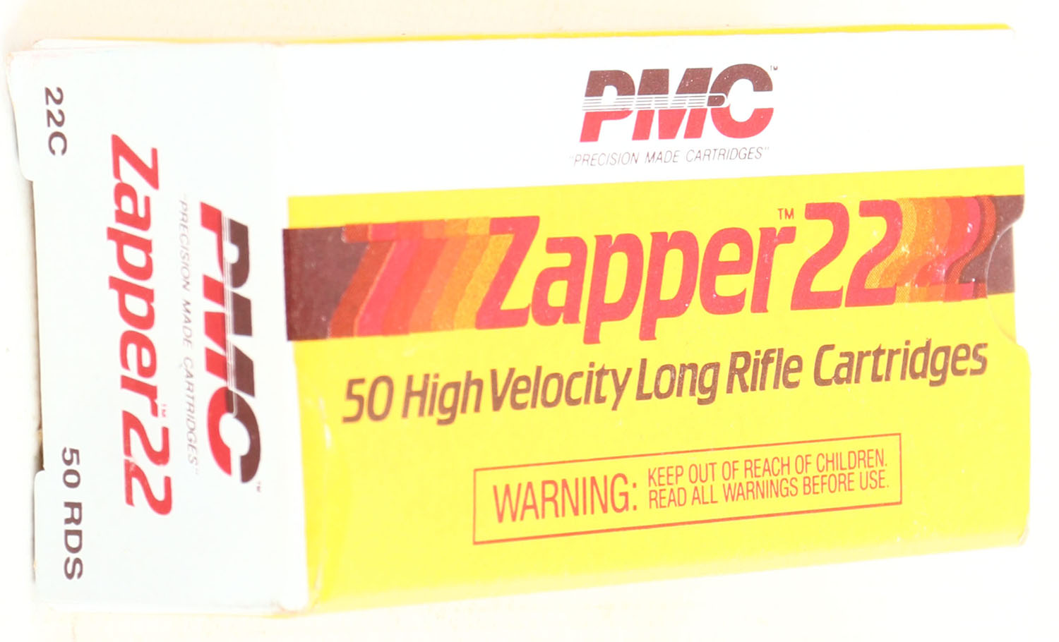 PMC, Zapper 22, .22 Long Rifle, High Velocity, RHWeb: PMC-1 LR-2c, Full, 1pc. Yellow white & red box, box is near mint with minty color, only minor corner ding on top front corner, corners otherwise sharp, edges are crisp, end flaps are solid, ammo is excellent. Grade: Excellent ++ - Value: 10 to 50