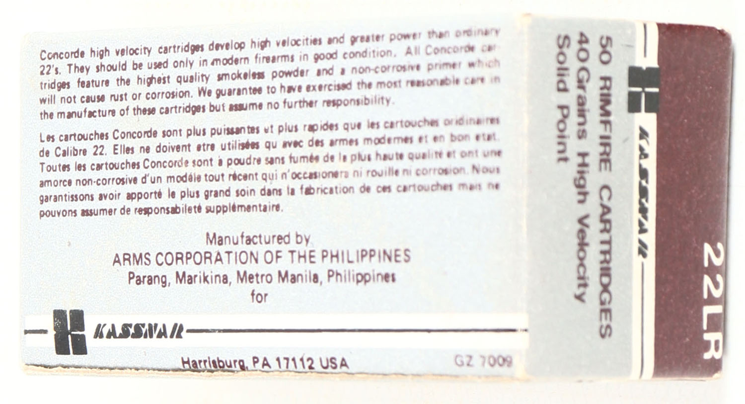 Arms Corporation of the Philippines, Concorde, .22 Long Rifle, RHWeb: (Philippines) AC-2 LR-2, Full, 1pc. Gray purple & white box, box is near mint with minty color, only very minor corner wear, edges are crisp, end flaps are solid, ammo is minty. Grade: Excellent ++ - Value: 10 to 50