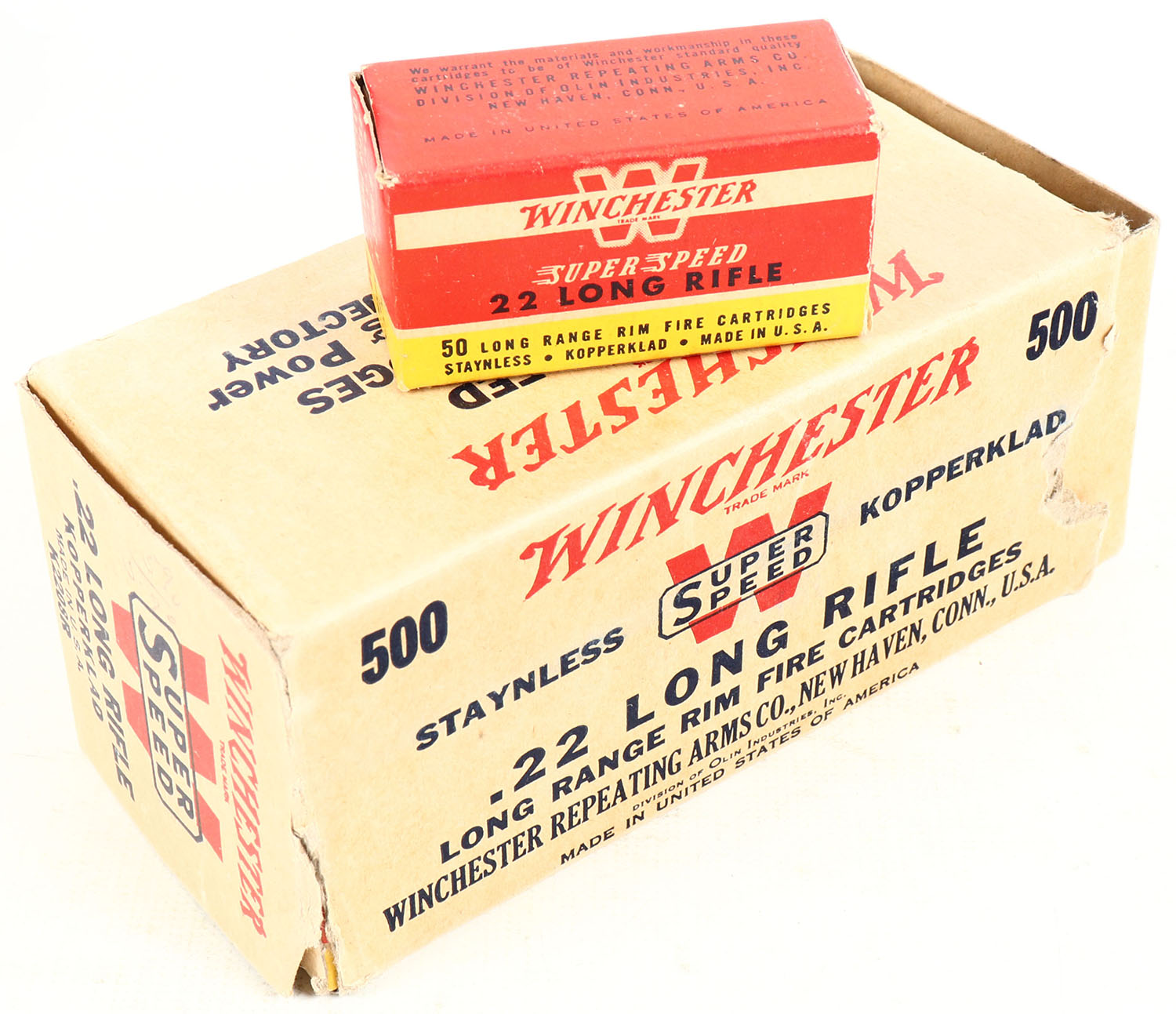 Winchester, Super Speed, .22 Long Rifle, Staynless Kopperklad, Full, 500rds. 1pc. Buff black & red brick, brick is solid with excellent color, several tears and partial seam splits, corner wear, edges are mostly crisp, left end flap partially torn, right end flap is solid and has been written on, inside boxes are very good to excellent, (2) boxes have creased end flaps. Grade: Very Good - Value: 50 to 150